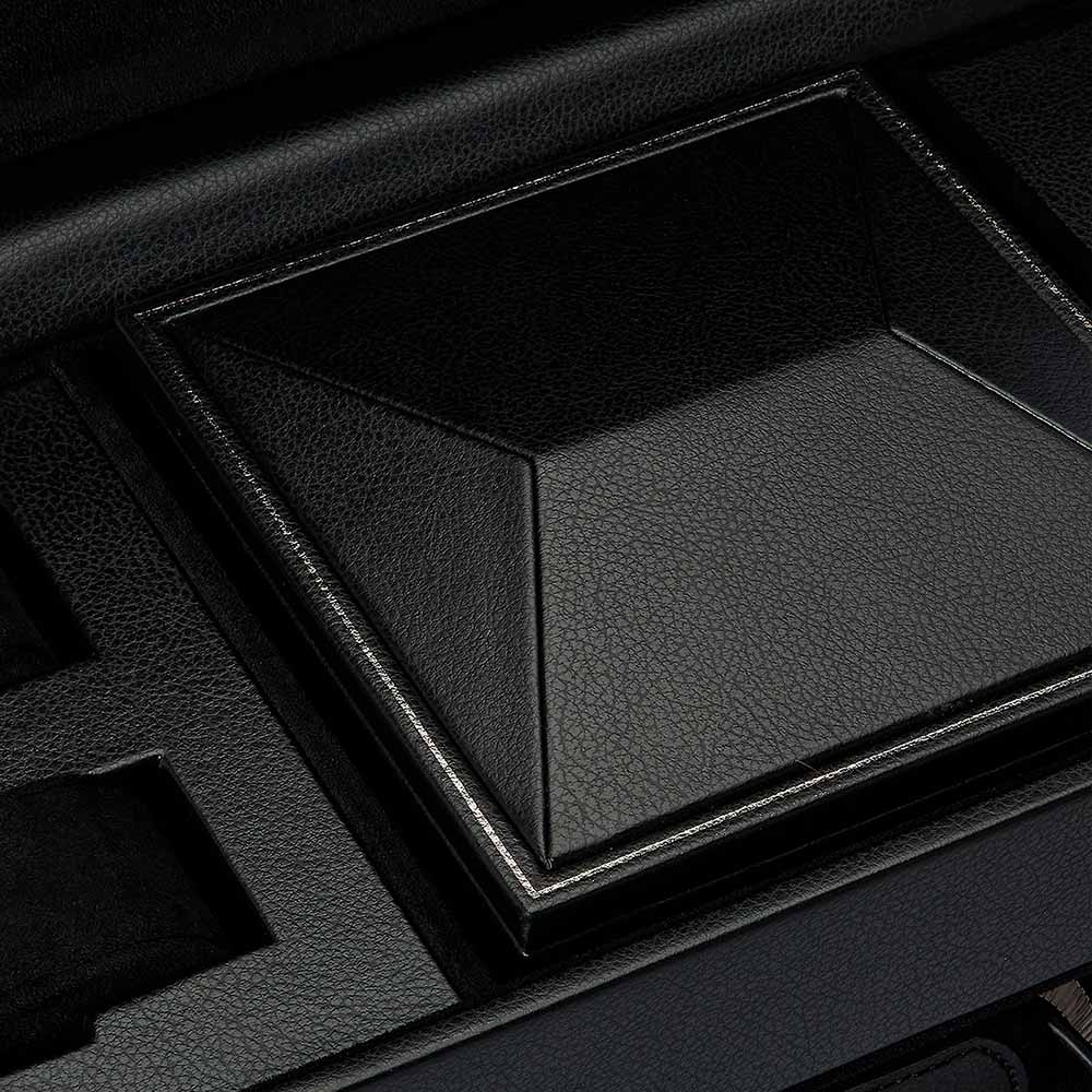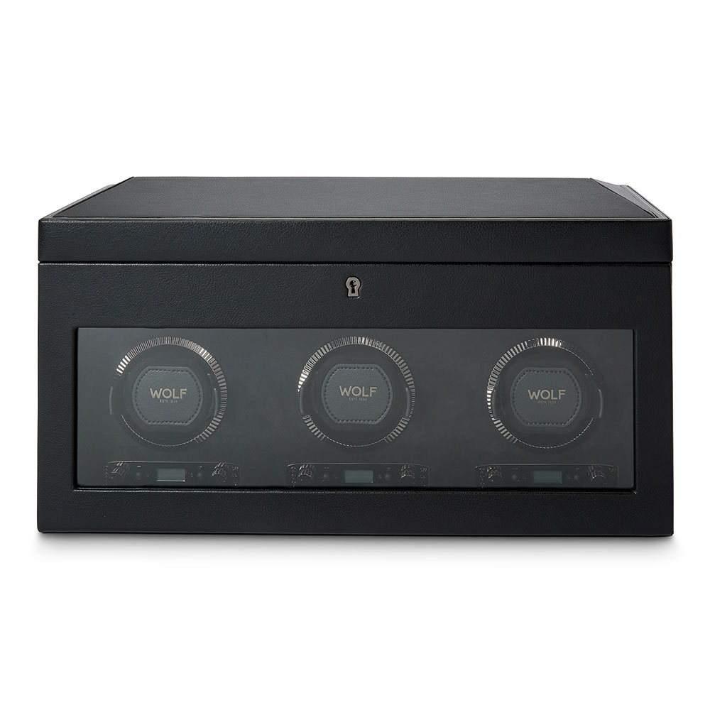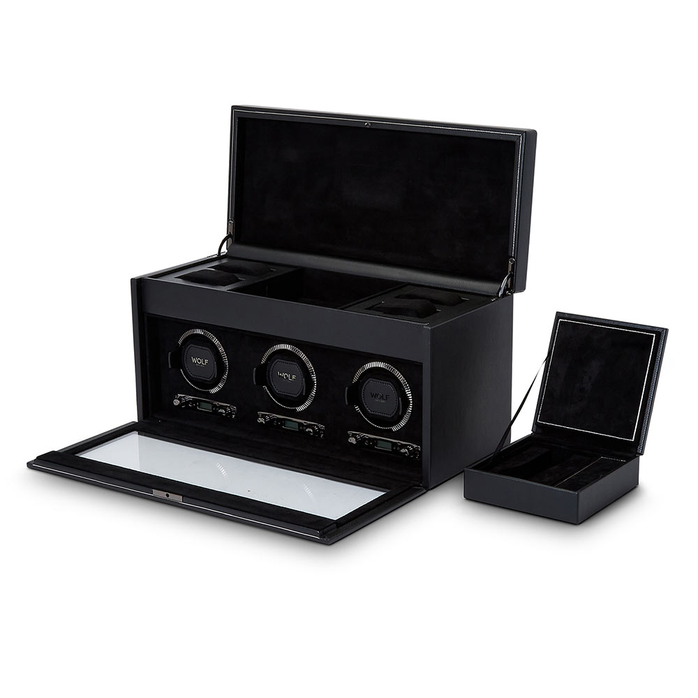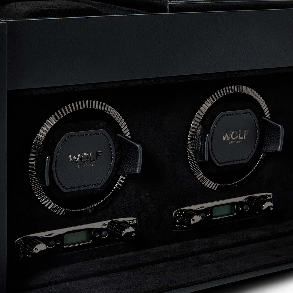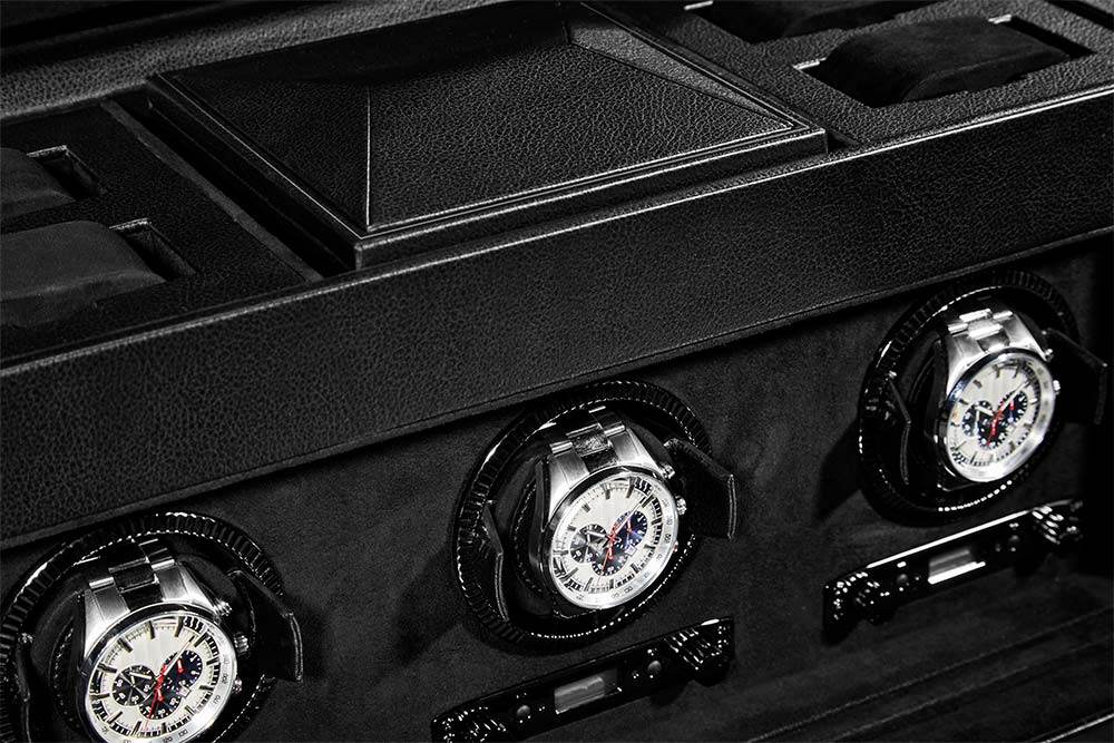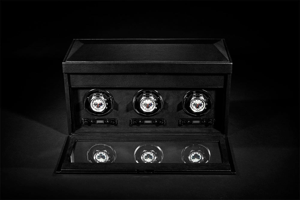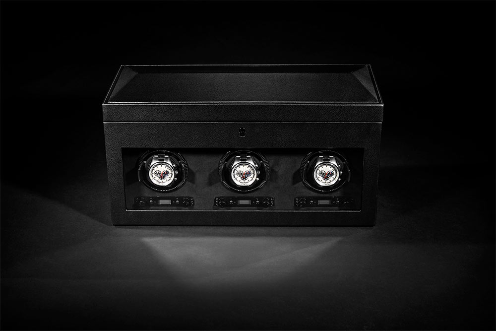 Vysoce kvalitní natahovač WOLF British Racing 792302 pro natahování tří hodinek s automatickým nátahem. V horní části je další úložný prostor pro uložení 4 hodinek na polštářcích a 1 ve vyhrazené cestovní části s klapkou. Ručně vyráběné pouzdro z nejkvalitnější veganské kůže zdobené prvky v černé barvě. Skleněná tabule chrání hodinky a vnitřek natahovače hodinek před prachem a nečistotami. Rotomat lze zavřít klíčem. Exkluzivní design natahovače hodinek WOLF British Racing z něj dělá jeden z nejoblíbenějších modelů na trhu příslušenství k automatickým hodinkám.