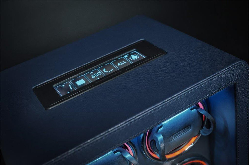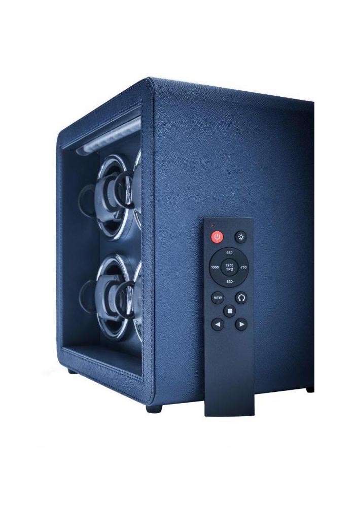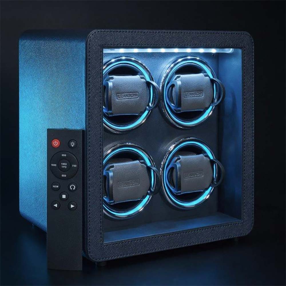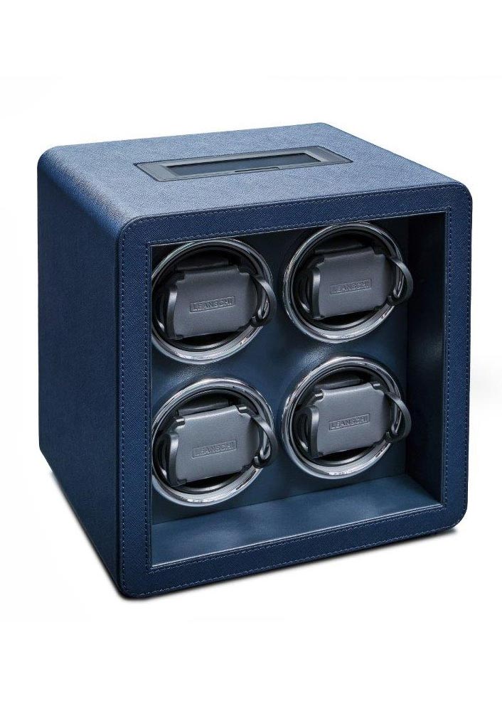 Windomat Leanschi WM04-SA12 pro 4 hodinky v modré barvě. Vysoce kvalitní zařízení pro natahování hodinek s automatickým nátahem. Elegantní verze ze dřeva zdobená modrou veganskou kůží. PAD, který se ovládá pomocí dálkového ovladače a LED diod, umožňuje rychlé a snadné nastavení. Není třeba stahovat žádnou aplikaci nebo software, není třeba aktualizovat a párovat. Každý buben navíječe lze ovládat samostatně: v pohybu se udrží pouze hodinky, které chceme.