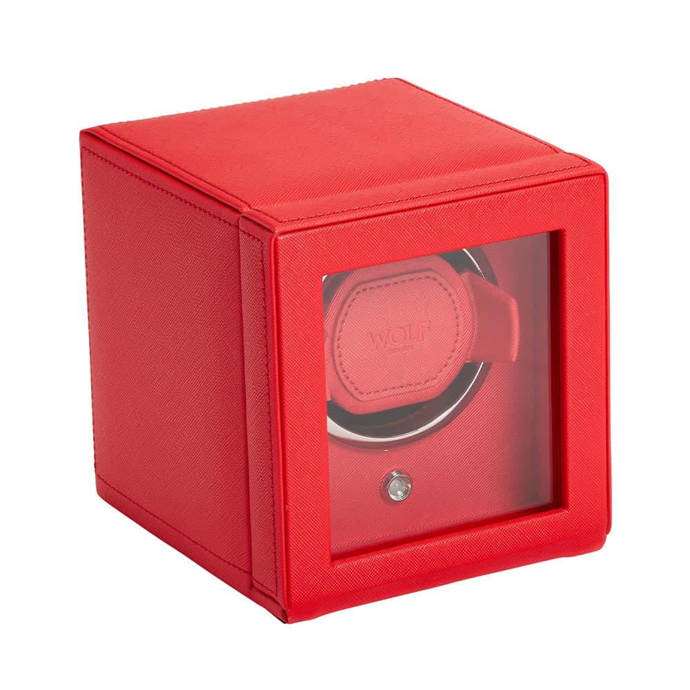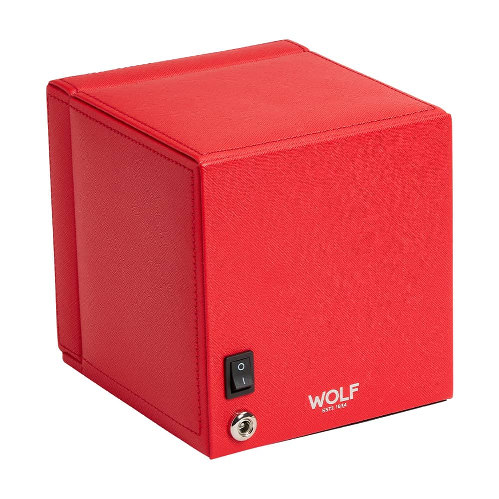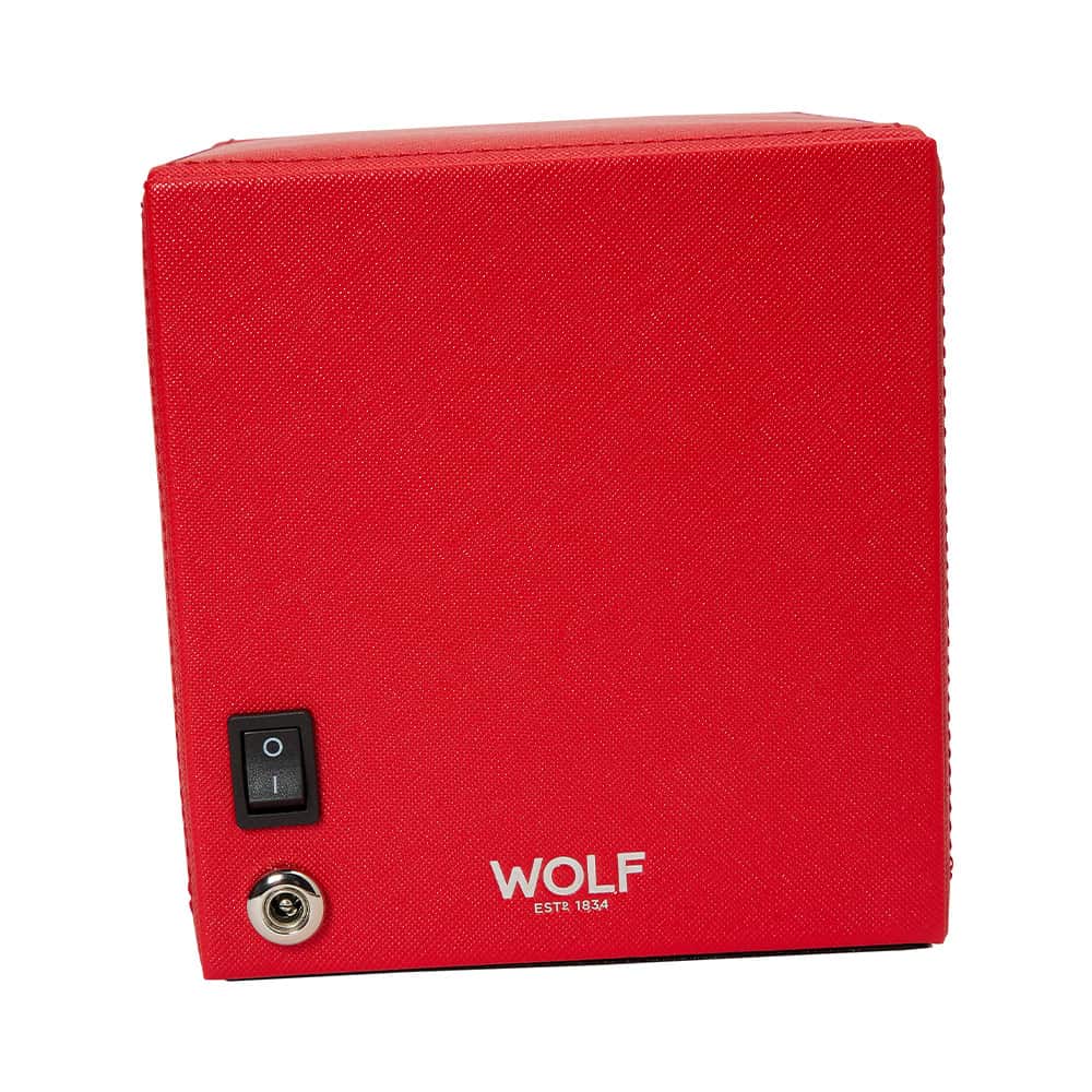 Windomat WOLF Cub 461172 pro 1 hodinky s možností uložení . Čtvercový rotomat zakončený červenou veganskou kůží. WOLF Cub je dvoucestný navíječ s patentovanými řešeními dostupnými pouze u značky WOLF. Tento natahovač hodinek počítá přesný počet otáček, což vám umožňuje pečovat o stav vašeho hodinkového mechanismu s extrémní přesností. Všechny ostatní větrné stroje pouze odhadují počet roztočení na základě časových intervalů.