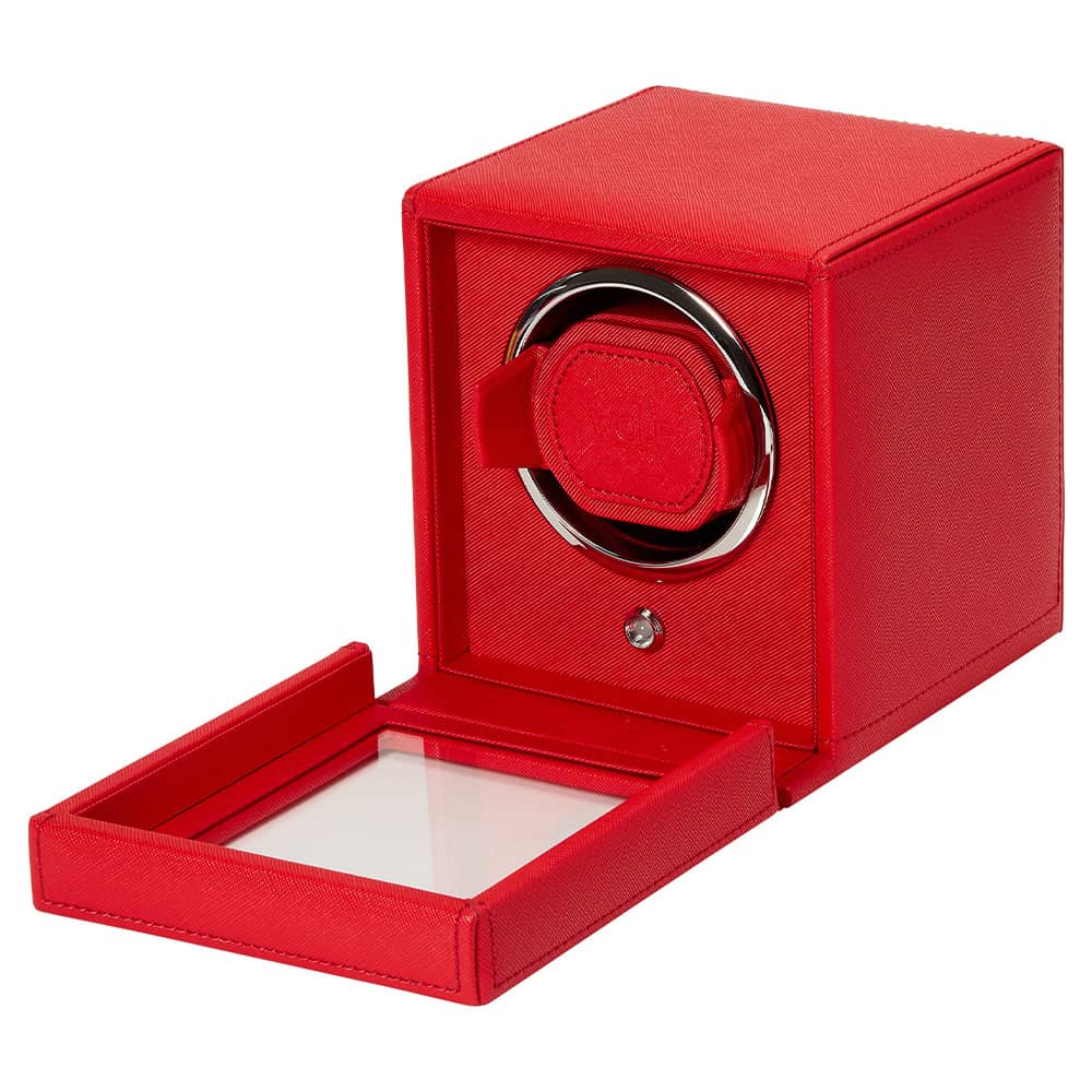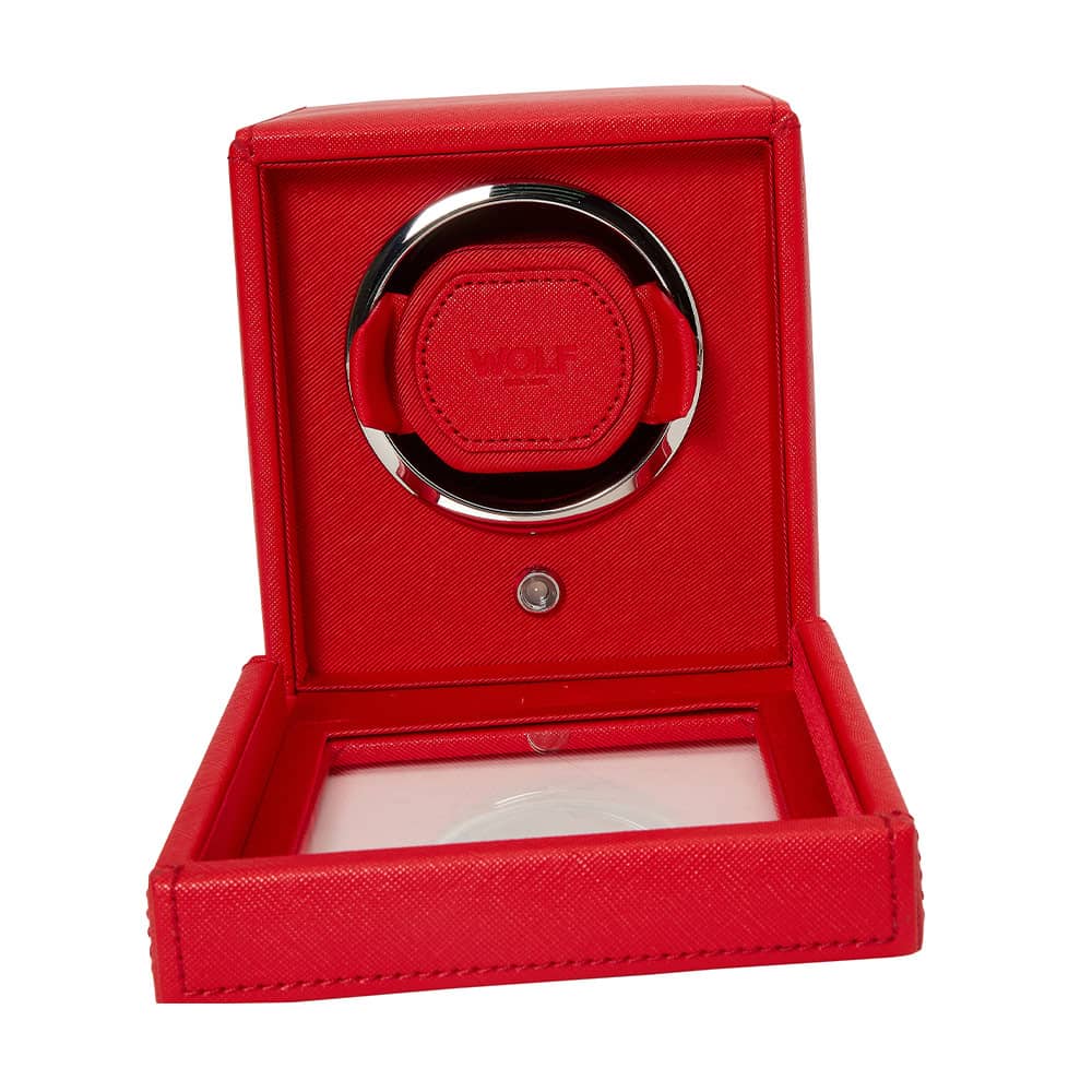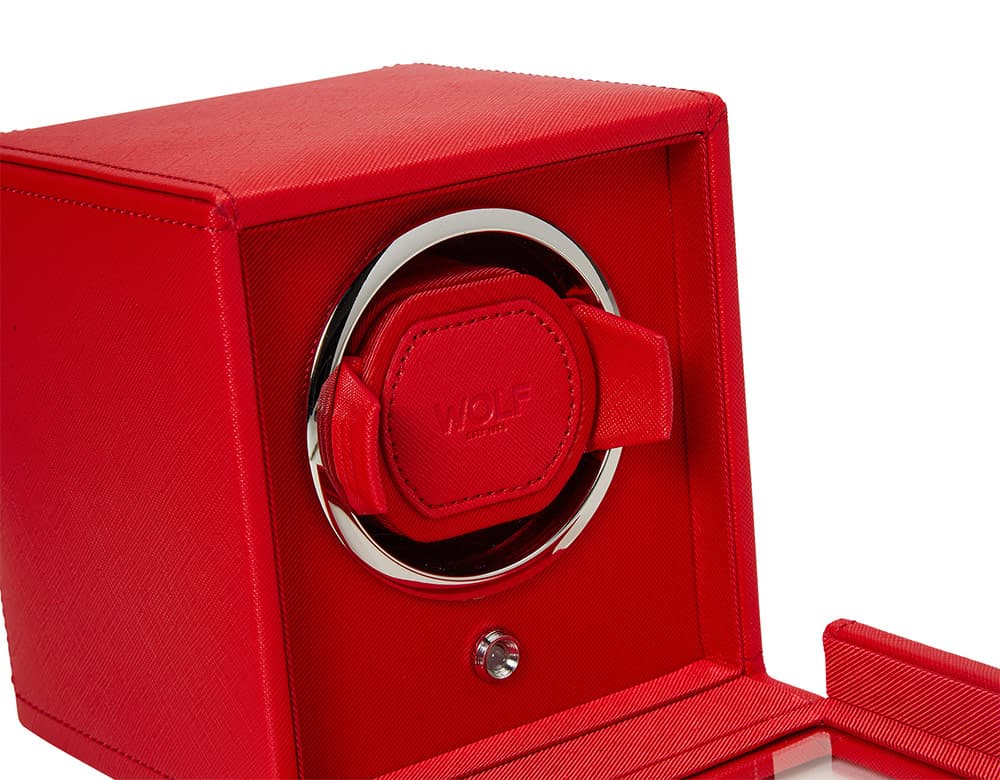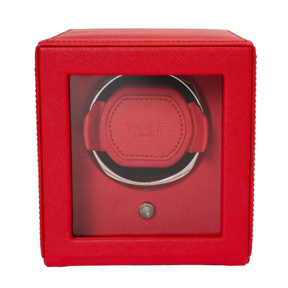 Windomat WOLF Cub 461172 pro 1 hodinky s možností uložení . Čtvercový rotomat zakončený červenou veganskou kůží. WOLF Cub je dvoucestný navíječ s patentovanými řešeními dostupnými pouze u značky WOLF. Tento natahovač hodinek počítá přesný počet otáček, což vám umožňuje pečovat o stav vašeho hodinkového mechanismu s extrémní přesností. Všechny ostatní větrné stroje pouze odhadují počet roztočení na základě časových intervalů.