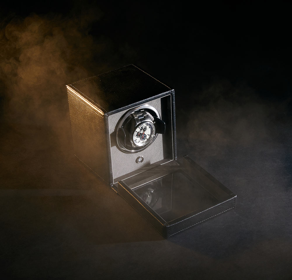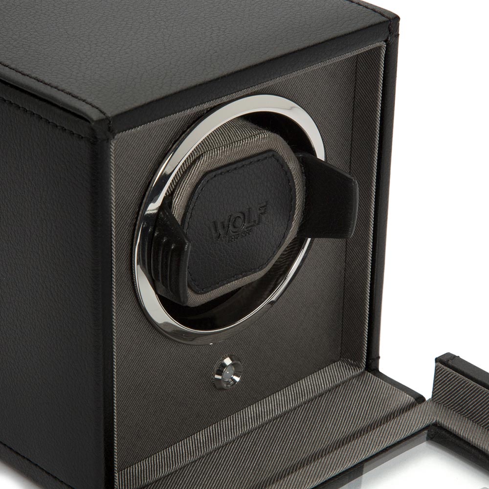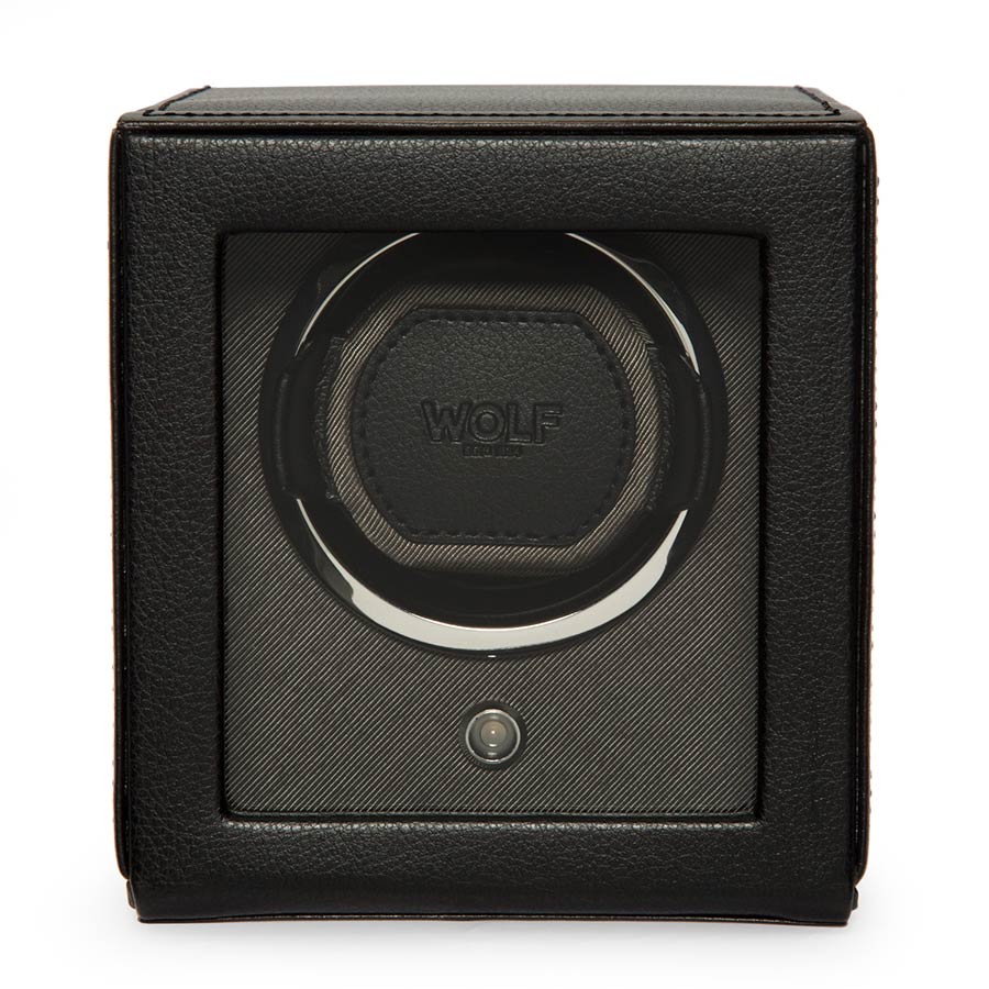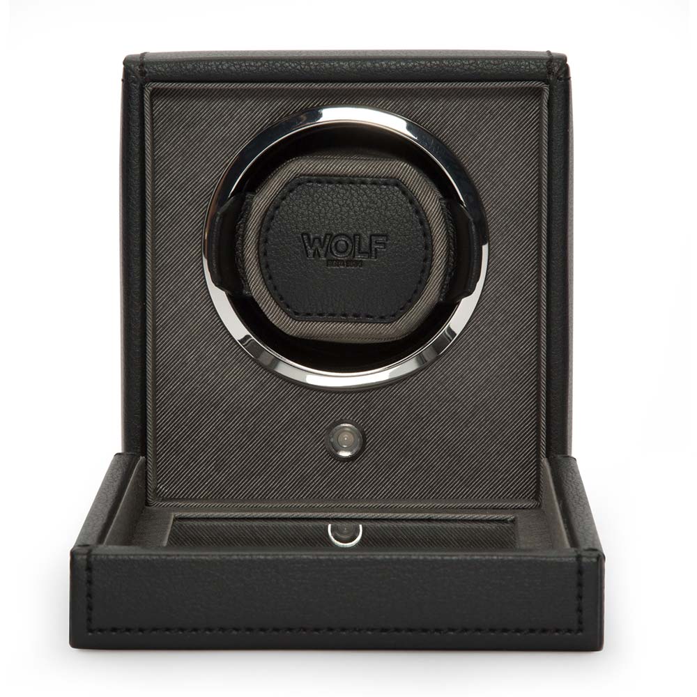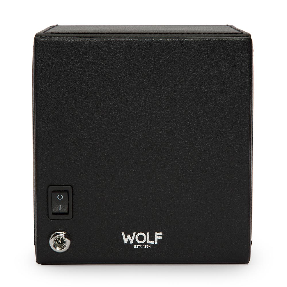 Kvalitní natahovač německé výroby pro natahování hodinek s automatickým nátahem. Pouzdro, ručně vyrobené z nejkvalitnější černé kůže, klade důraz na nejvyšší kvalitu a důraz na detail. Skleněná tabule v otevřeném víku chrání hodinky a vnitřek natahovače před prachem a nečistotami. Exkluzivní design WOLF Cub Winder With Cover z něj dělá jeden z nejoblíbenějších modelů na trhu s příslušenstvím k automatickým hodinkám. Hodinky umístěné v natahovači hodin vypadají efektně, což přispívá k zatraktivnění interiéru každé stylové místnosti zajímavou dekorací.