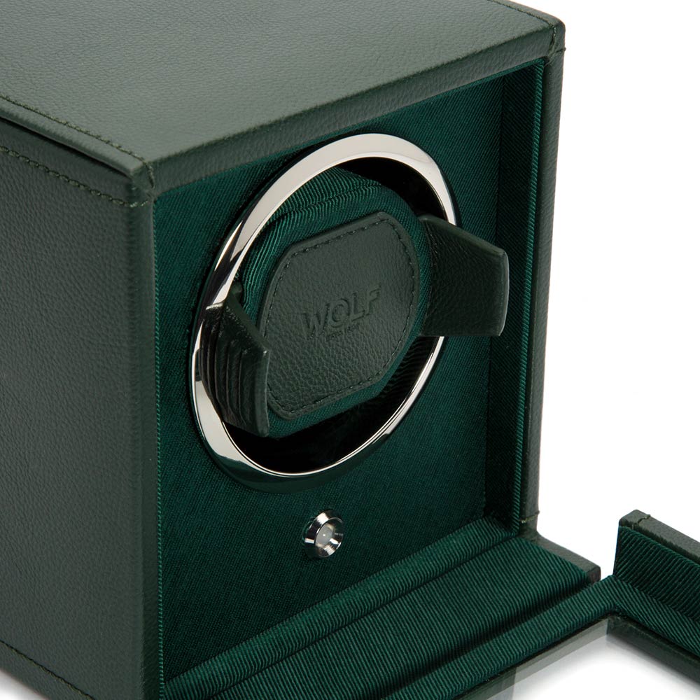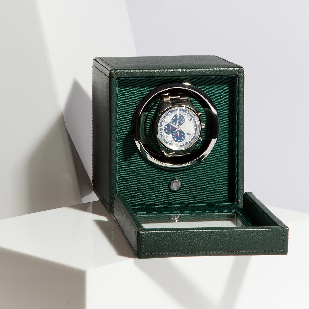 Kvalitní natahovač německé výroby pro natahování hodinek s automatickým nátahem. Pouzdro, vyrobené ručně z nejkvalitnější tmavě zelené lícové kůže, klade důraz na nejvyšší kvalitu a důraz na detail. Skleněná tabule v otevřeném víku chrání hodinky a vnitřek natahovače před prachem a nečistotami. Exkluzivní design WOLF Cub Winder With Cover z něj dělá jeden z nejoblíbenějších modelů na trhu s příslušenstvím k automatickým hodinkám. Hodinky umístěné v natahovači hodin vypadají efektně, což přispívá k zatraktivnění interiéru každé stylové místnosti zajímavou dekorací.