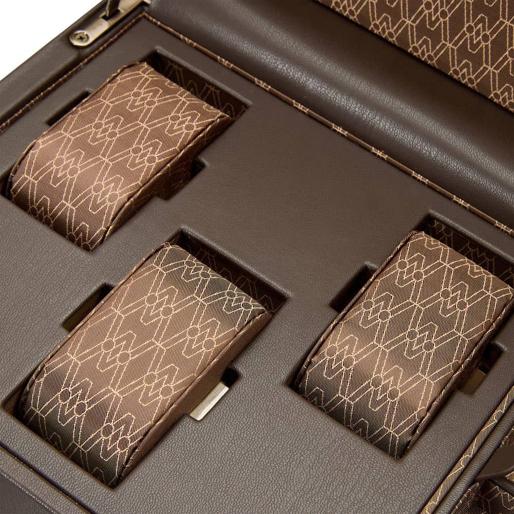 Natahovač WOLF Double Earth Limited Edition 190406 z kolekce ke 190. výročí značky je kombinací inovativního designu, vytříbeného stylu a udržitelného přístupu. Vnější skořepina z ekologické jablečné kůže decentně ladí s matnými kovovými detaily a elegantními rámečky, zatímco vnitřek dotváří recyklovaný hedvábný žakár, zdobený jedinečným motivem WOLF. Inovativní systém Dynamic Lock-in Cuff umožňuje nastavení na tři různé velikosti zápěstí, což zajišťuje stabilní umístění hodinek v hodinkách. Díky aplikaci WOLF Bluetooth si přesně nastavíte počet otáček za den a směr navíjení. V horní části zařízení jsou tři závěsné polštářky na hodinky a vyjímatelný tác s mnoha přihrádkami na cennosti.