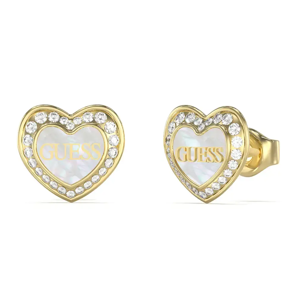 Pozlacené náušnice pecky ve tvaru srdce s perleťovou výplní a zirkoniemi Guess Amami JUBE04028JWYGWHT/U jsou ideální volbou na Valentýna, výročí nebo jako výjimečný dárek pro sebe.