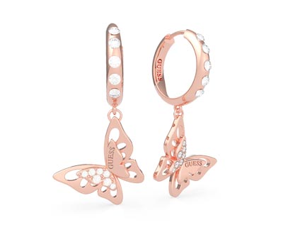 Visací náušnice pro ženy ve tvaru motýla s dvojitými křídly, gravírovaným logem GUESS a nášivkami Swarovski® crystal. Šperky pocházejí od známé americké firmy Guess z kolekce Fly Away. Byl vytvořen pro moderní a elegantní ženu plnou energie, lehkosti a pozitivního přístupu.