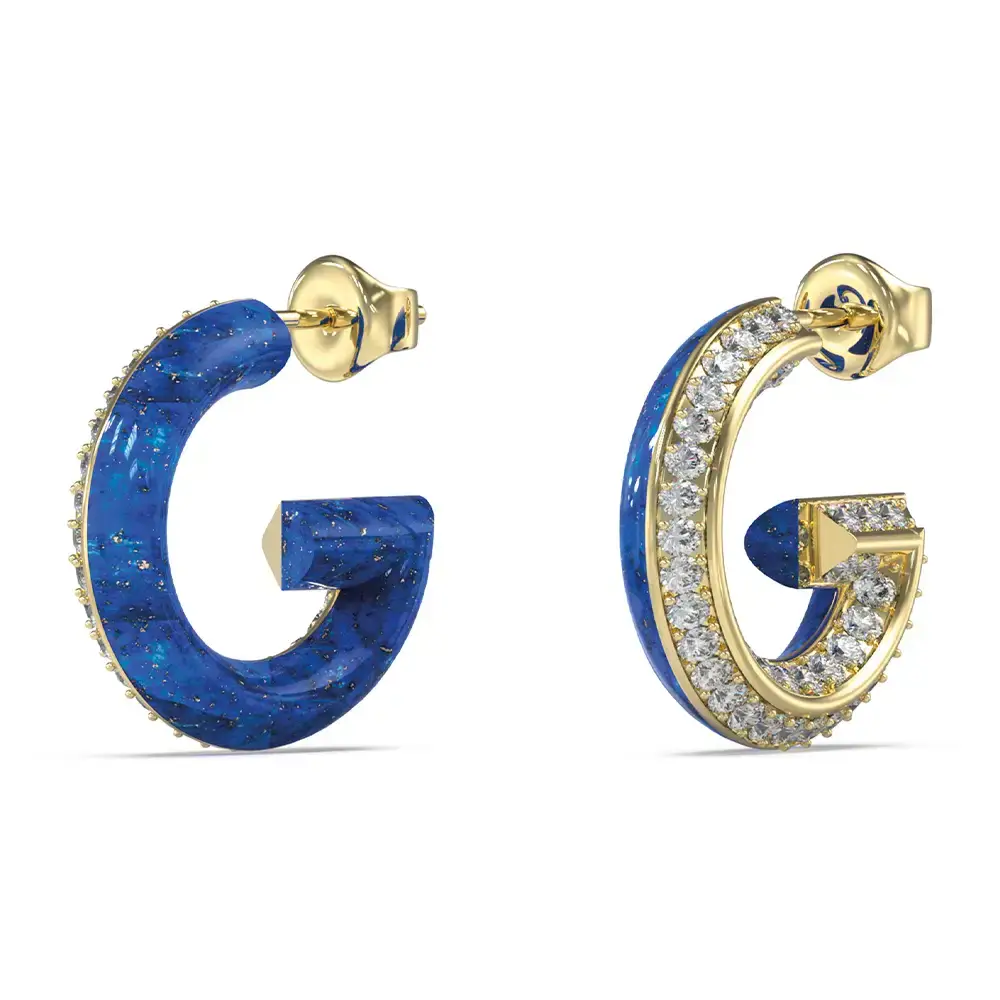 Modro-zlaté náušnice ve tvaru písmene G se zirkony Guess G Crystal JUBE05436JWYGBLT/U jsou stylové náušnice typu hoop, které zaujmou moderní interpretací ikonického motivu písmene G.