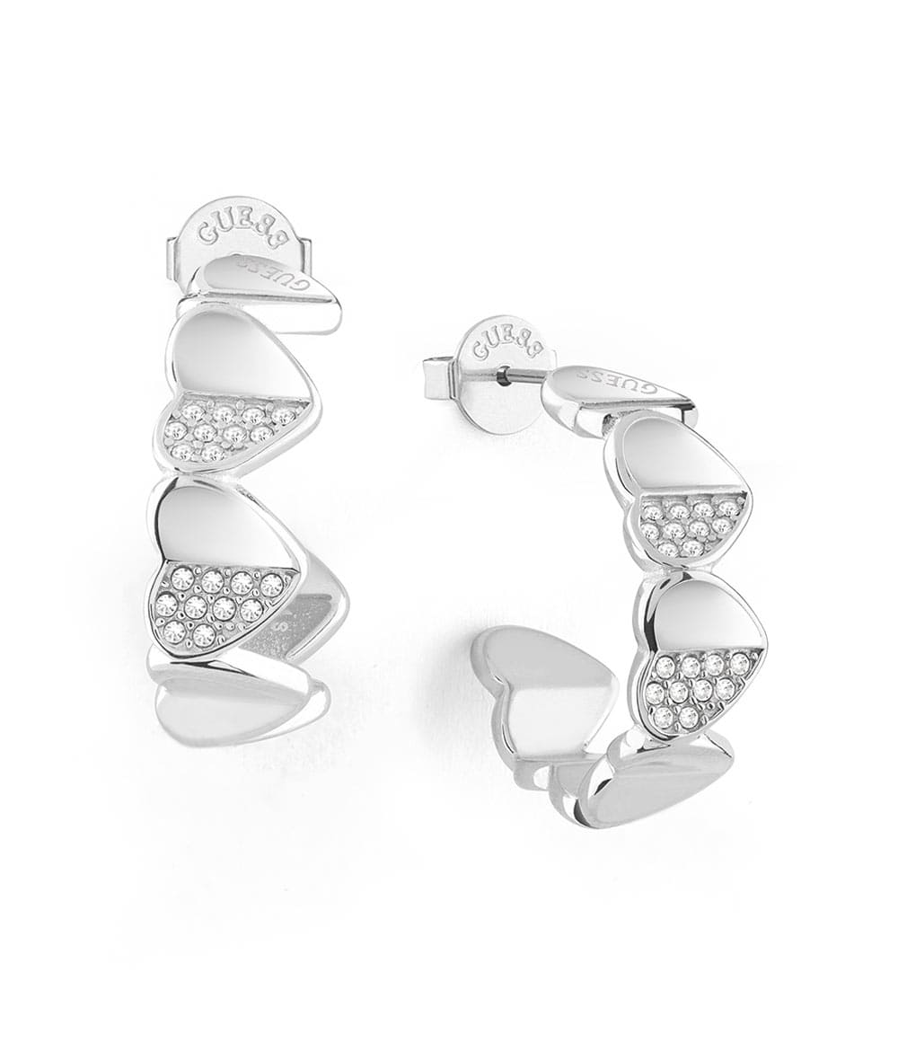 Elegantní, kulaté náušnice se srdíčky s krystaly. Srdce jsou rozdělena na dvě krásné poloviny. Jeden je zdobený lesklými zirkony a druhý hladkou vrstvou ve stříbrné barvě. Stříbrné půlkruhové náušnice Lovely Guess byly navrženy pro moderní ženu, která je fanynkou módních doplňků, zamilovaných motivů a elegantního lesku.