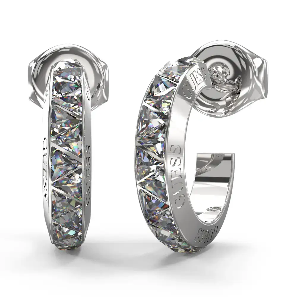 Stříbrné půlkruhové náušnice s kubickými zirkony Guess Trinity JUBE04573JWRHT/U jsou spojením moderního luxusu a oslnivého lesku, který přitahuje pohledy.