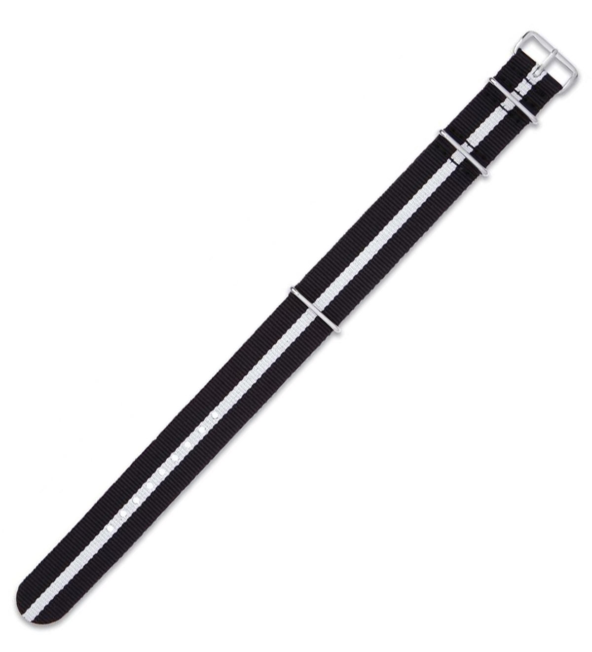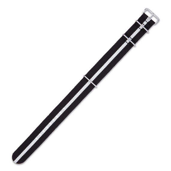 Textilní, nylonový řemínek k hodinkám ve stylu NATO. Černá barva s jedním bílým pruhem uprostřed. Skvěle ladí se sportovními, vojenskými nebo retro hodinkami. Řemínek NATO byl navržen speciálně pro armádu, aby obstál v náročných podmínkách během misí. Vyniká lehkostí, voděodolností a odolností. Je vhodný pro plavání, potápění a vydrží extrémní podmínky pod vodou i na souši. Řemínek NATO je dostupný ve velikostech 18 mm, 20 mm a 22 mm, které je třeba zvolit při zadávání objednávky.