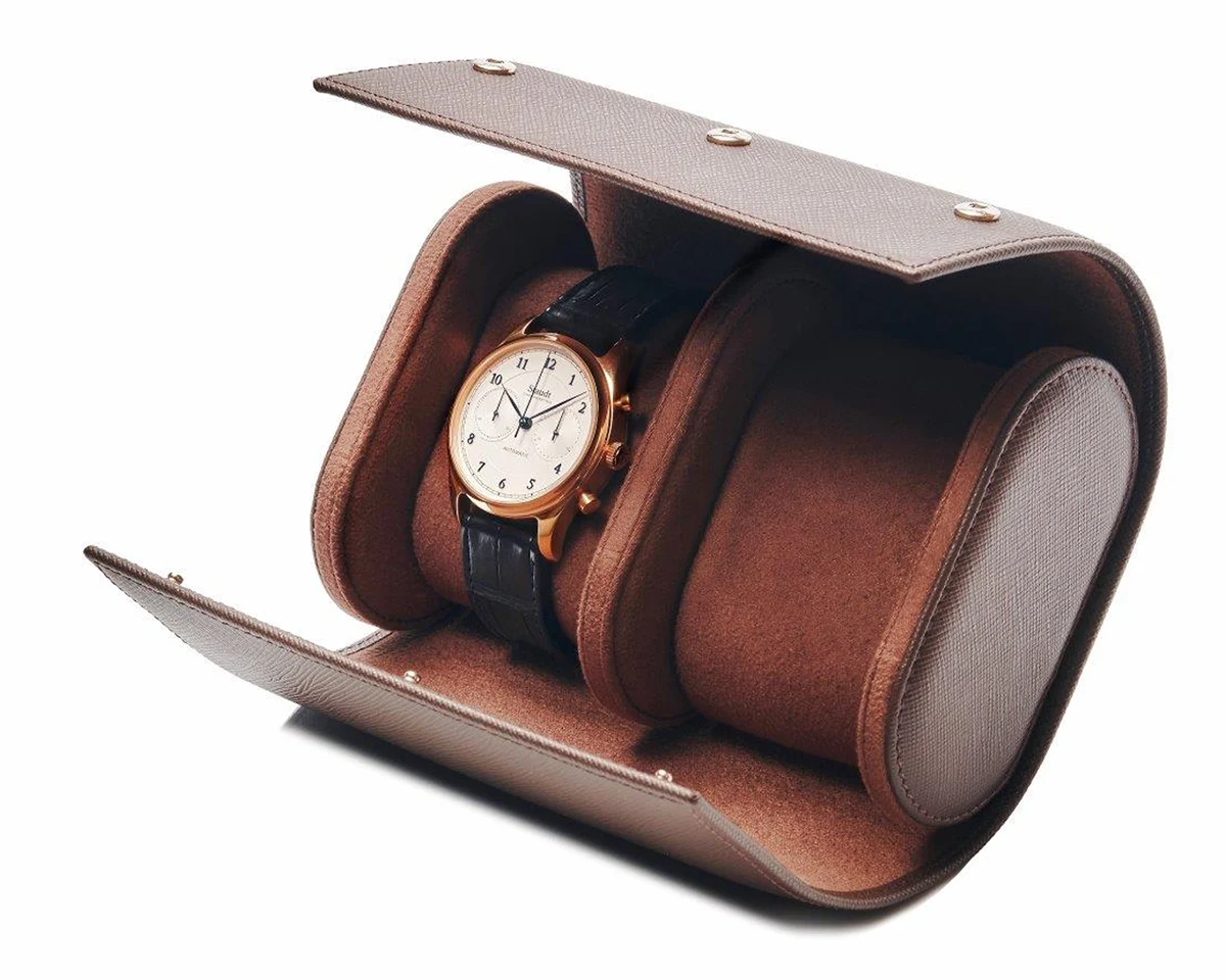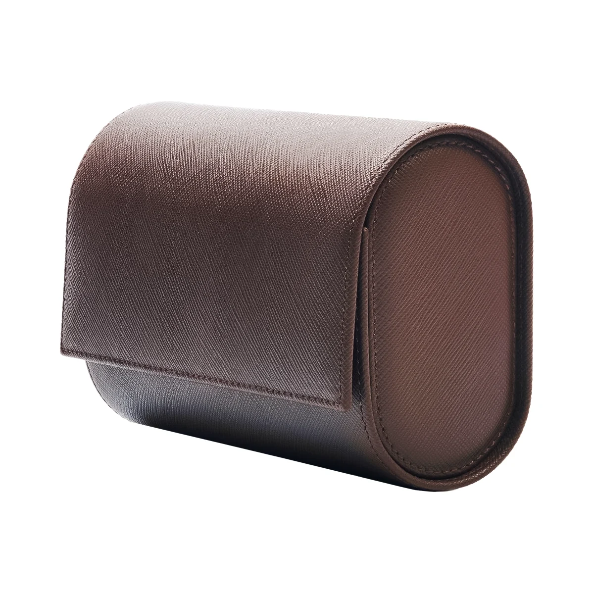 Leanschi WRO2-SA11 je luxusní pouzdro na dva hodinky, vyrobené z přírodní telecí kůže s fakturou saffiano v elegantní hnědé barvě. Precizní zpracování a kontrastní prošívání podtrhují třídu tohoto doplňku, zatímco kompaktní rozměry (14,5 × 7,3 × 10,8 cm) z něj činí ideální řešení jak pro ukládání hodinek doma, tak i na cestách.
