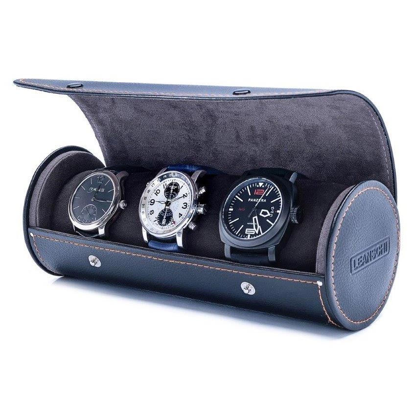 Elegantní oválné pouzdro, krabička na 3 ks hodinek Leanschi WRO3-BLAK. Vnitřek boxu je potažen kvalitním šedým vločkovým vláknem a opatřen měkkými polštářky. Tato role je ideální pro uložení hodinek v trezoru nebo pro bezpečnou přepravu hodinek na cestách: praktická, skladná a snadno se uloží do příručního zavazadla.