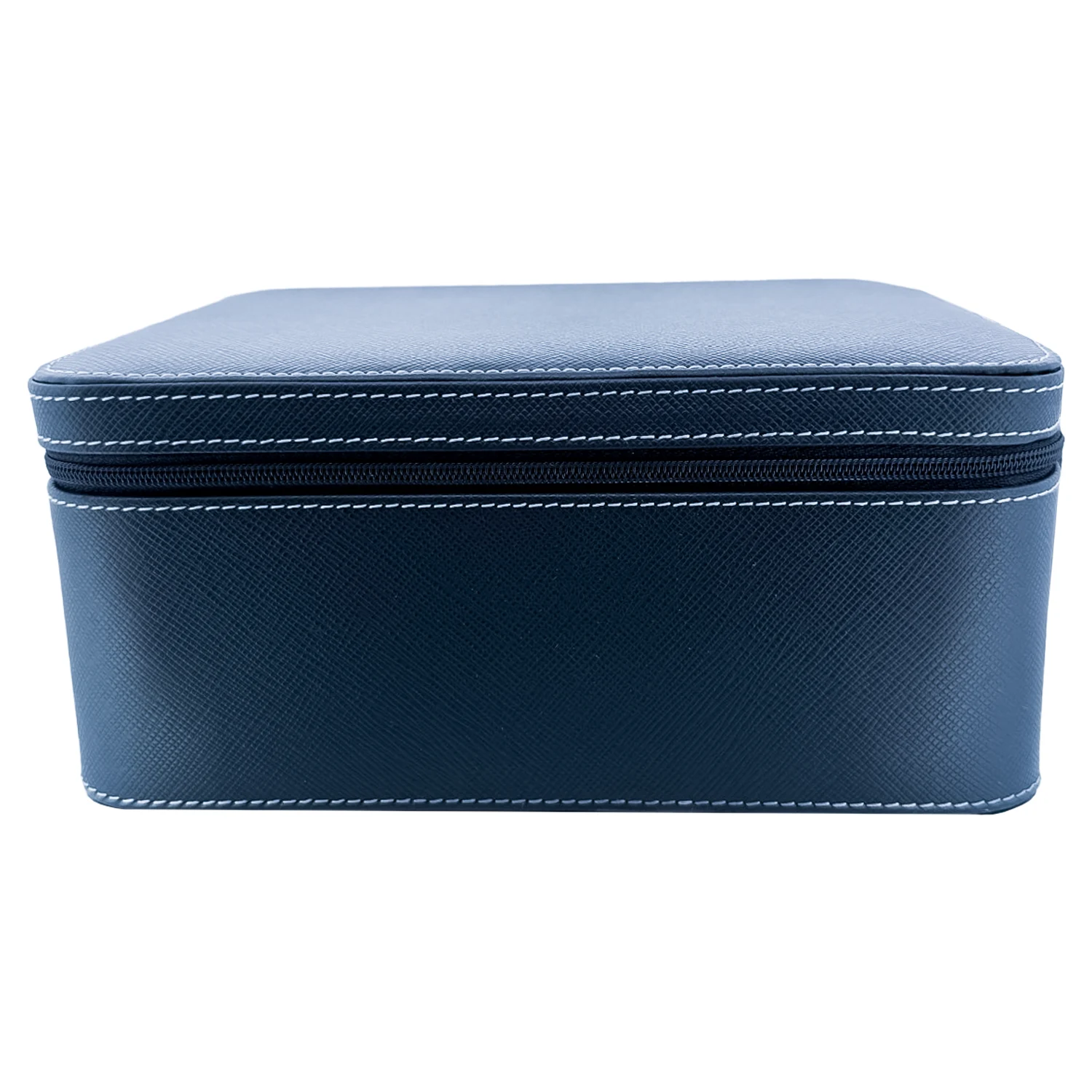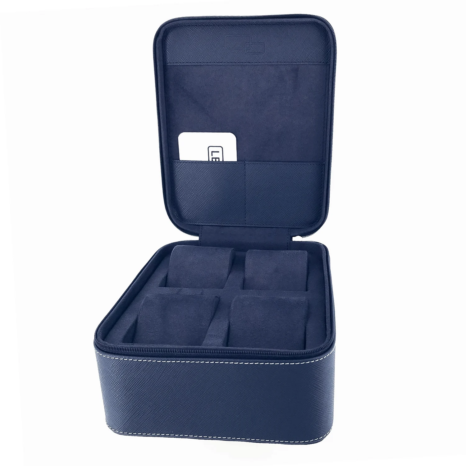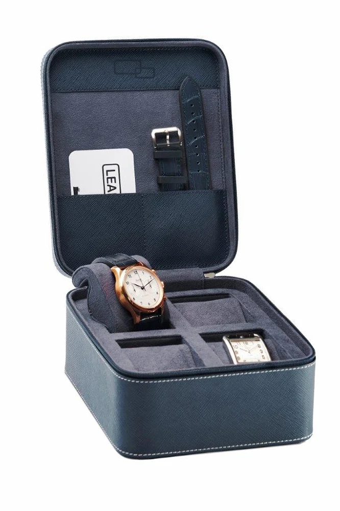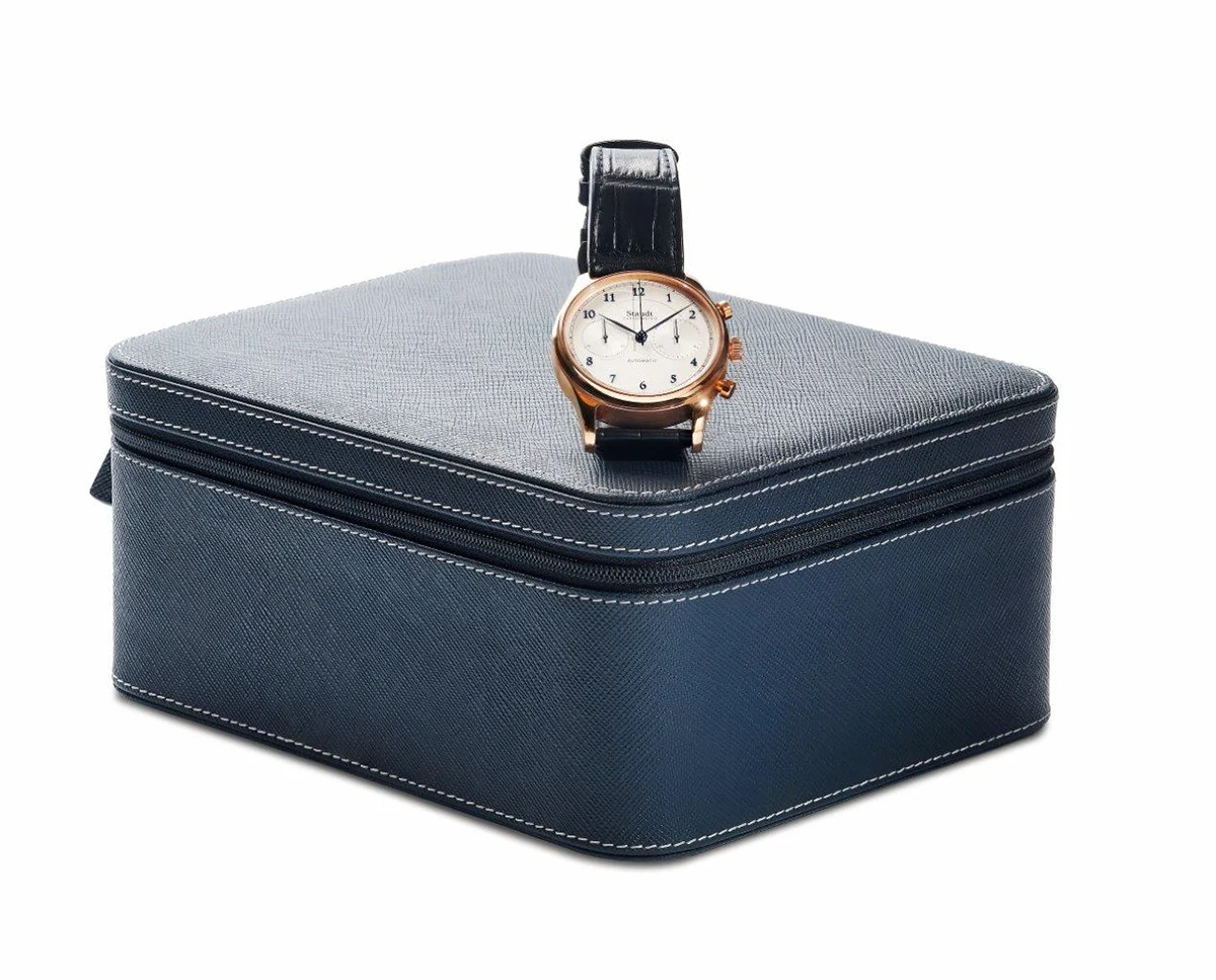 Konstrukce založená na pevném rámu potaženém přírodní kůží v provedení saffiano v barvě Navy Blue se vyznačuje elegancí a nadčasovým stylem. Zip otevírá vnitřek vyložený měkkým materiálem, ve kterém se nacházejí čtyři samostatné polštářky. Díky nim má každé hodinky své místo, jsou stabilní a chráněné před poškrábáním. Další vnitřní kapsa umožňuje uložit dokumenty nebo záruční karty. Pouzdro má kompaktní rozměry 20 × 16 × 9 cm, což z něj činí ideální doplněk do kufru nebo domácí zásuvky.