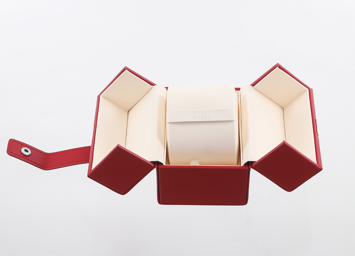 Originální cestovní pouzdro O94101125 na hodinky Omega . Velmi odolný transportní box v červené barvě se zavíráním na klip. Uvnitř je speciální výplň, na kterou se hodinky nasazují.