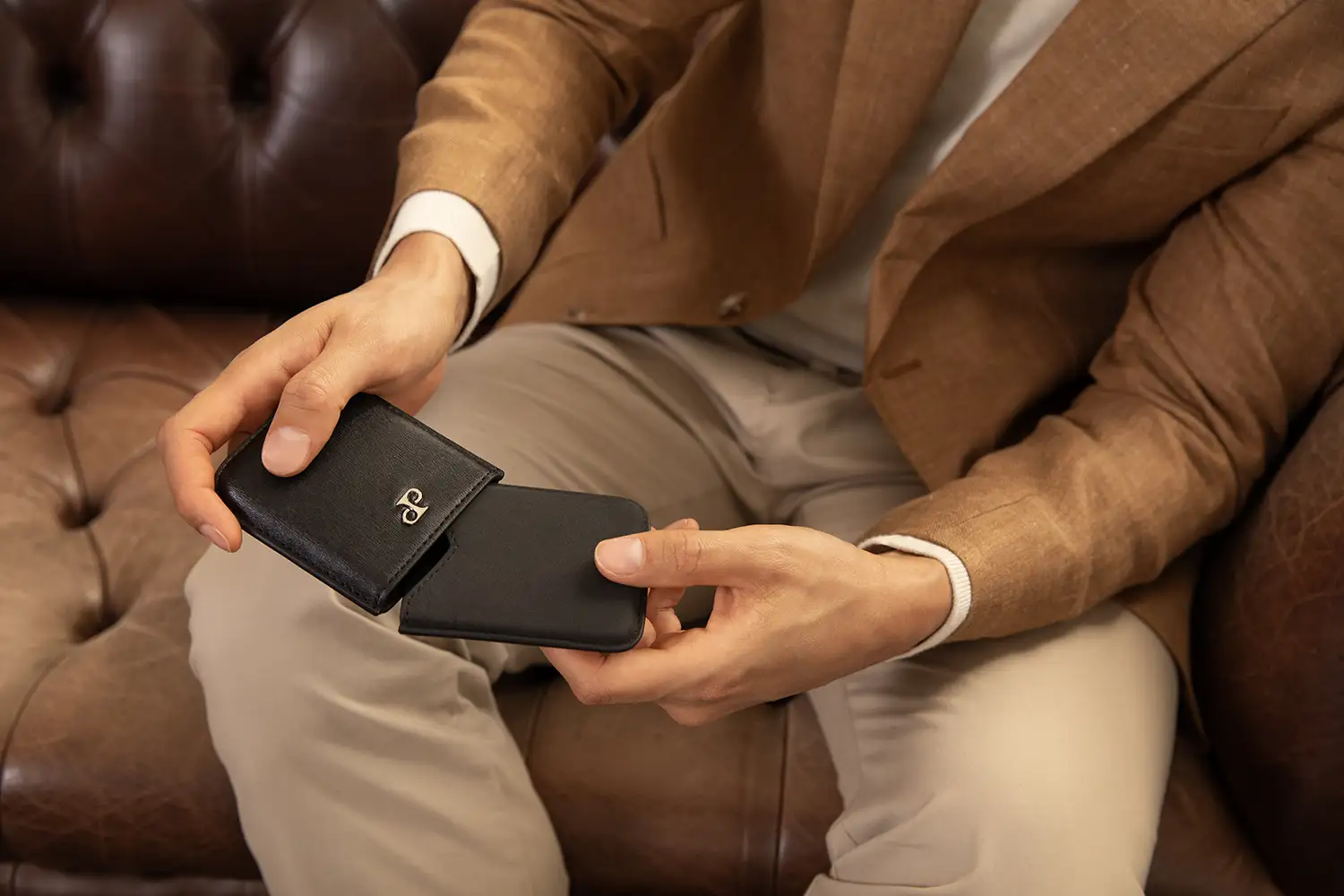 Pevná konstrukce typu moulded case umožňuje bezpečné uložení vizitek nebo platebních karet a chrání je před ohnutím či poškozením. Kompaktní rozměry zajišťují, že se pouzdro snadno vejde do kapsy nebo tašky, zatímco decentní stříbrné logo DP mu dodává prestižní charakter.