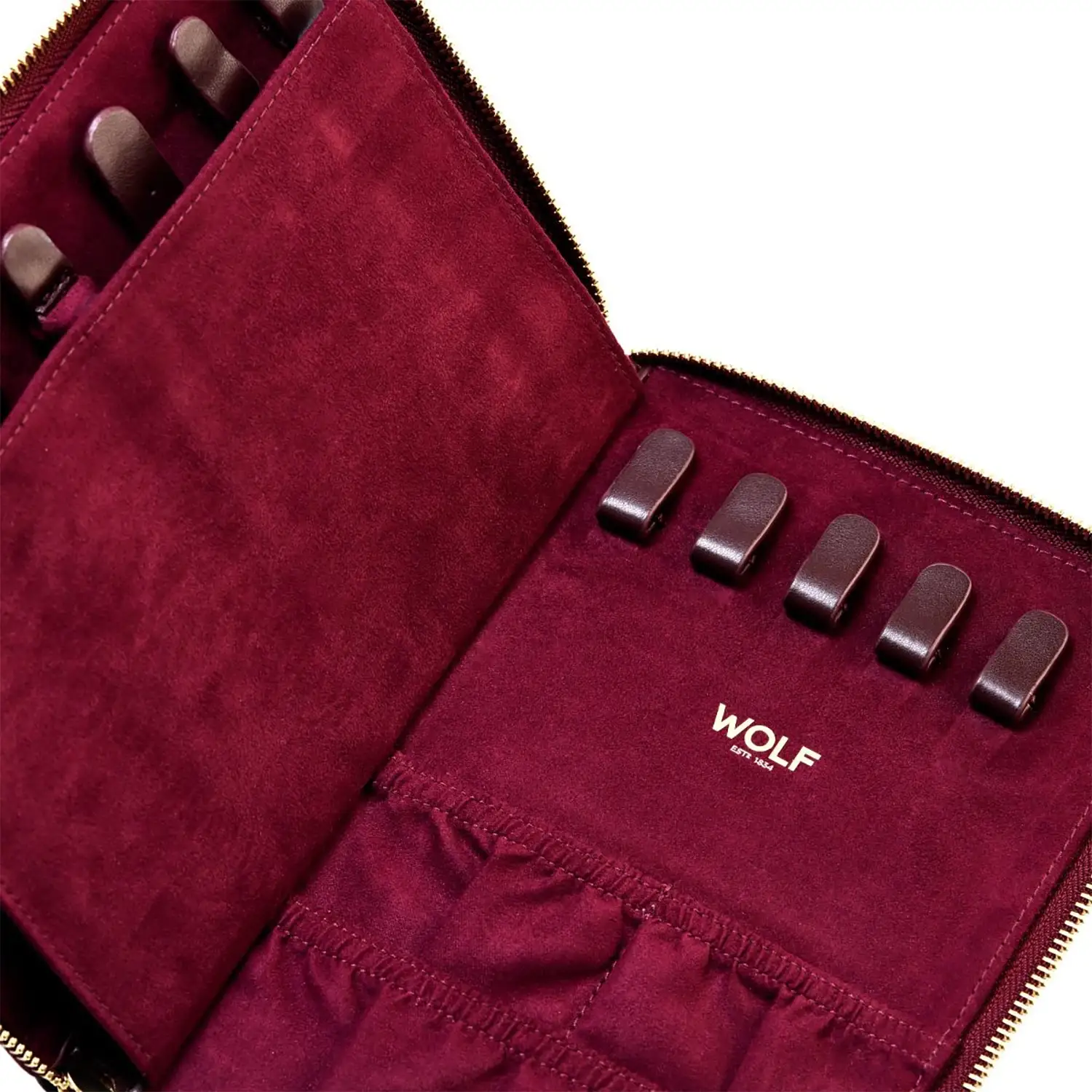 Pouzdro WOLF Bella 781426 je luxusní peněženka na šperky v odstínu hlubokého bordó, která spojuje vytříbenou estetiku s vynikající funkčností. Skládaný povrch z veganské kůže a zlaté detaily provedení vytvářejí elegantní doplněk, který se skvěle hodí jak pro domácí použití, tak i na cesty.