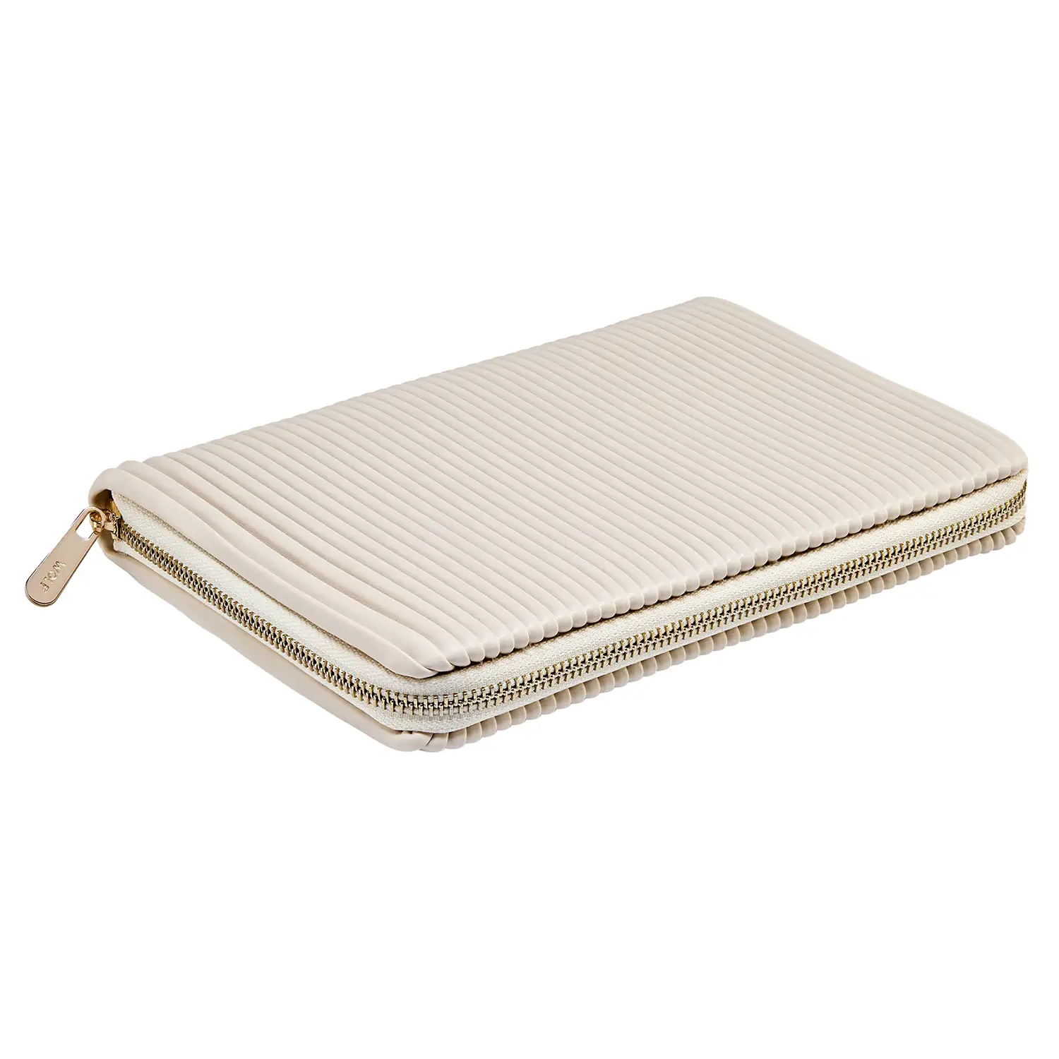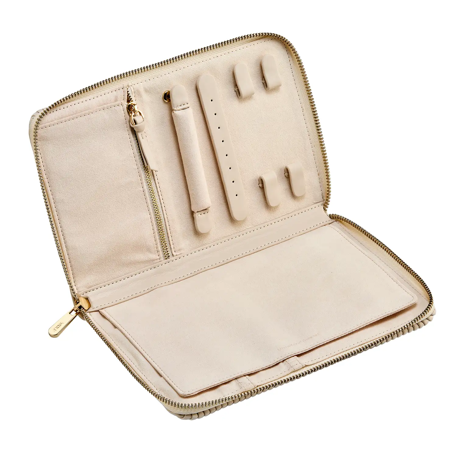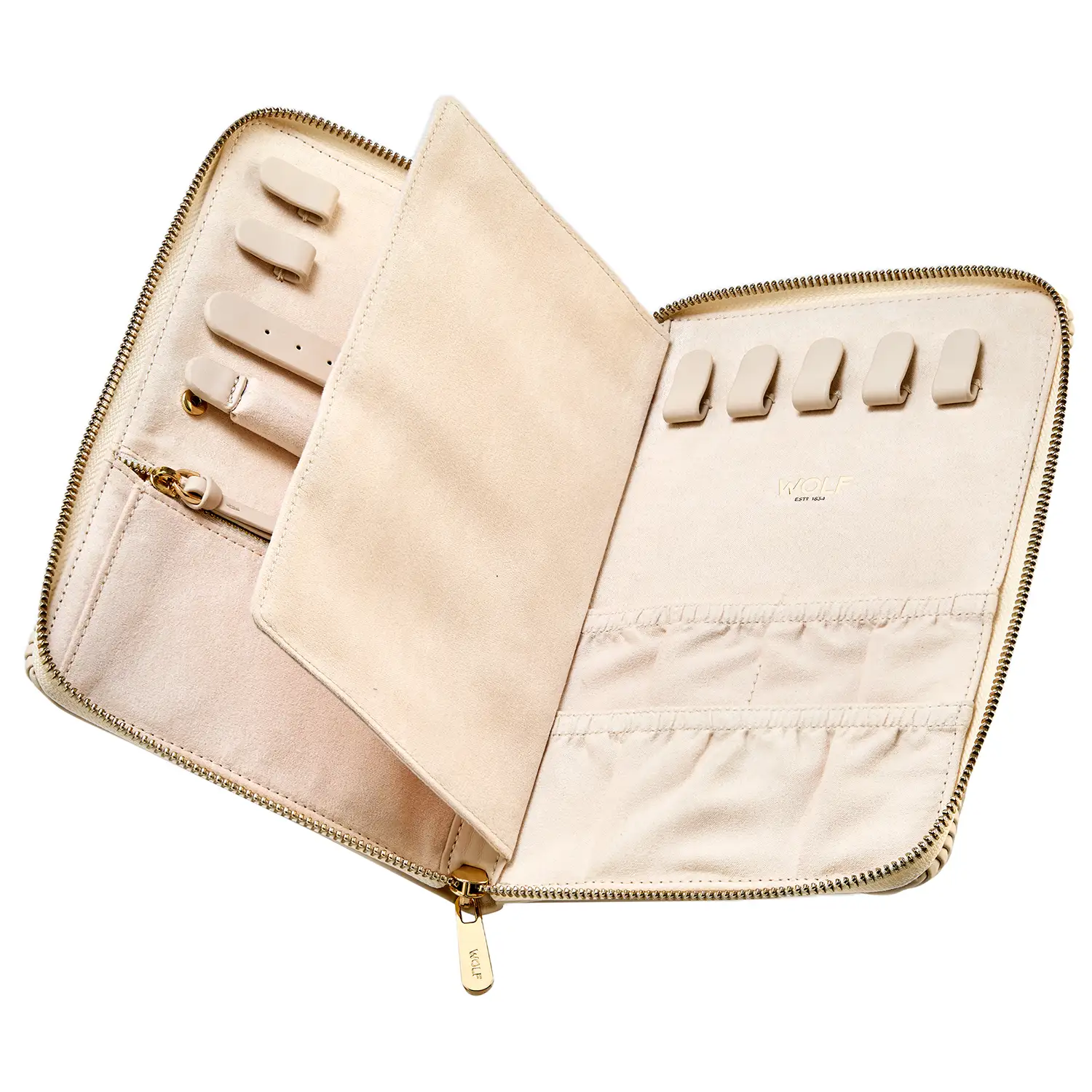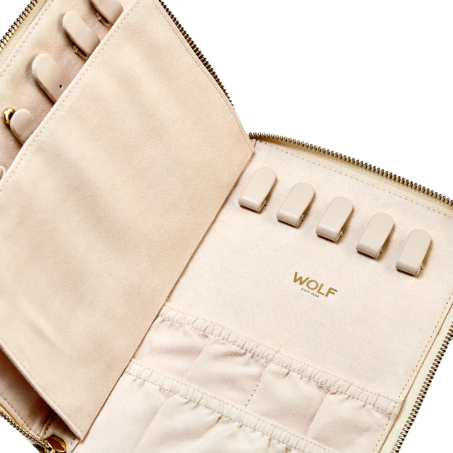 Pouzdro WOLF Bella 781453 je vytříbené šperkařské portfolio, které spojuje moderní luxus s praktickým interiérem. Stylová plisovaná textura a zlaté detaily vytvářejí elegantní vzhled, který dokonale ladí s vytříbeným vkusem majitelky.