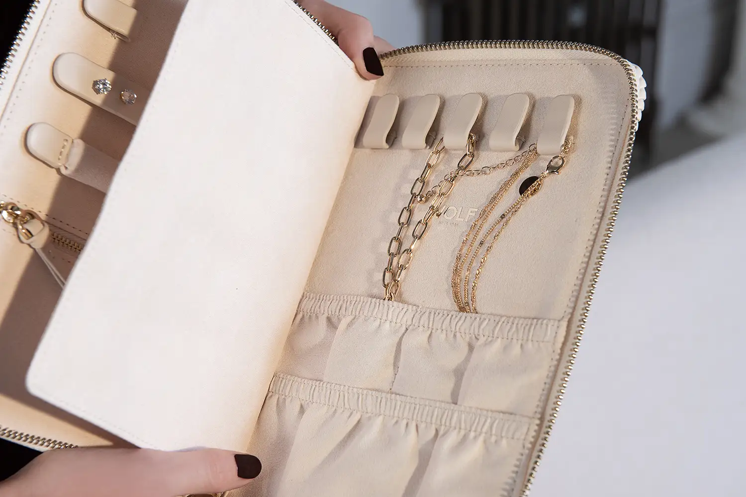 Uvnitř se nachází podšívka z inovativní tkaniny LusterLoc™, která chrání šperky před zmatněním. Promyšlené uspořádání zahrnuje 5 háčků na řetízky a 4 na náramky, každý s elastickou kapsičkou proti zamotání. Vnitřní prostor dále nabízí místo na náušnice a prsteny i praktickou kapsu na zip na drobné doplňky.