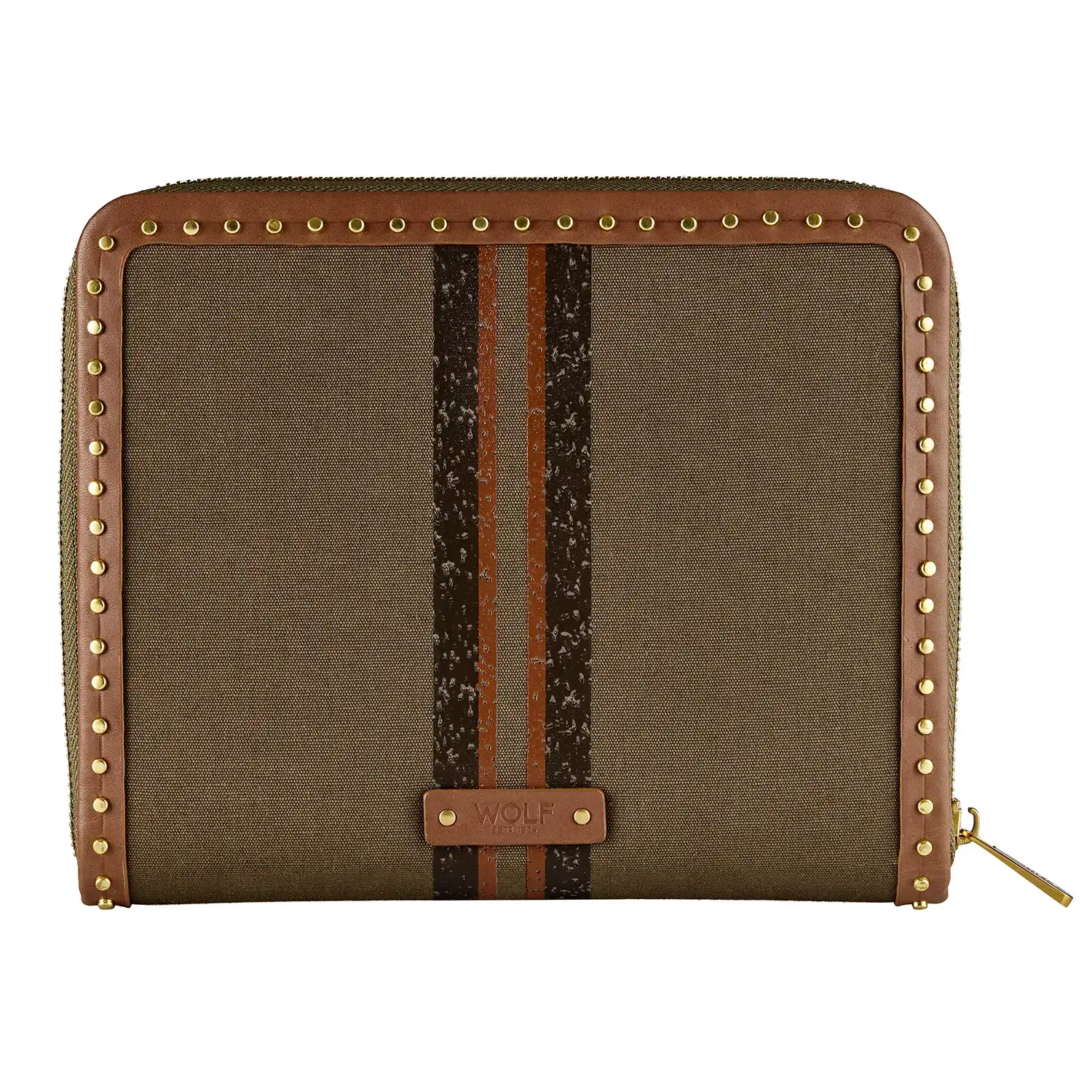 WOLF Ida 190043 je elegantní cestovní pouzdro na šperky, vytvořené pro ženy, které si cení dokonalé organizace, stylu a vysoké kvality zpracování. Inspirované klasickými kufry, je vyrobeno z recyklovaného plátna v odstínu khaki, s doplňky z přírodní kůže z certifikované koželužny a jemnými mosaznými detaily.