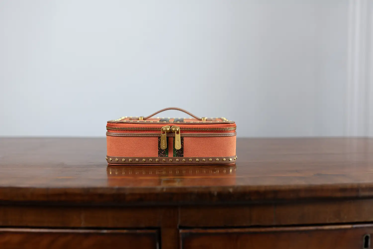 Pouzdro má mosazné nýty, pevné kožené držadlo a dvojitý zip, což mu dodává elegantní, lehce vintage charakter. Vnitřek je vyložen měkkou podšívkou Ultrasuede s technologií LusterLoc™, která chrání šperky před matněním až po dobu 35 let. Dva vyjímatelné tácy, váleček na prsteny, držák na náušnice a samostatná kapsička na zip umožňují pohodlné uložení šperků a doplňků.