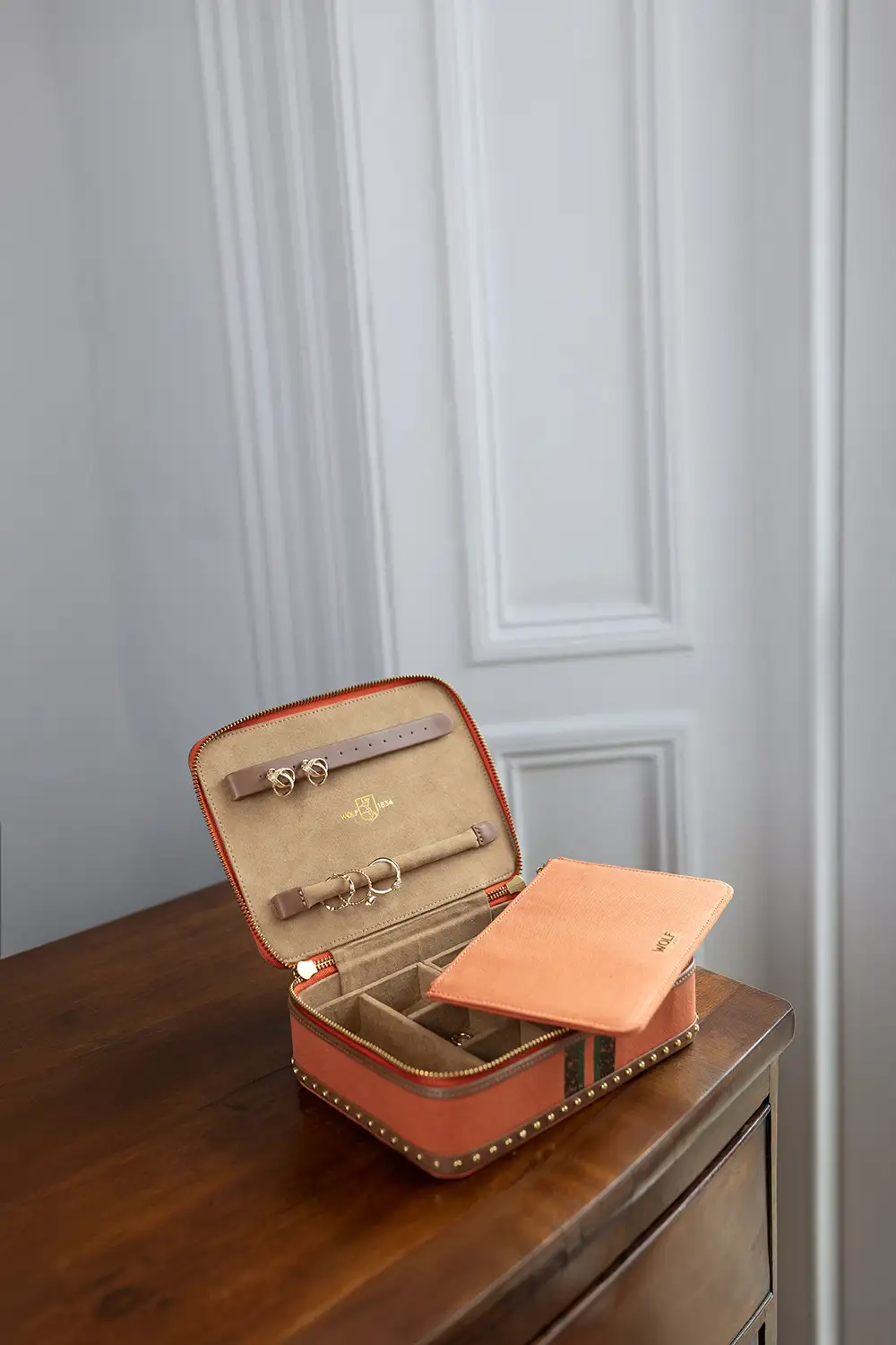 WOLF Ida 190045 je luxusní cestovní pouzdro na šperky, navržené pro ženy, které si cení stylu, funkčnosti a uvědomělého přístupu k módě. Inspirované klasickými cestovními kufry, kombinuje tkaninu z recyklu s detaily z přírodní kůže pocházející z garbiarny se zlatým standardem certifikace. Oranžová barva dodává energii a modernost, čímž vytváří stylový akcent jak doma, tak na cestách.