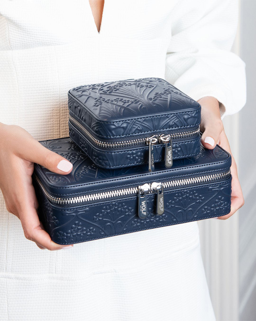 Pouzdro na šperky WOLF x Liberty 381217 je elegantní cestovní doplněk vytvořený pro ženy ve spolupráci s londýnským domem Liberty. Udržované v hlubokém modrým odstínu s charakteristickými ražbami inspirovanými stylem Liberty vyniká luxusním vzhledem a nadčasovou estetikou. Je to nabídka pro ty, kteří chtějí elegantním způsobem ochránit své šperky na cestách i při každodenním používání.