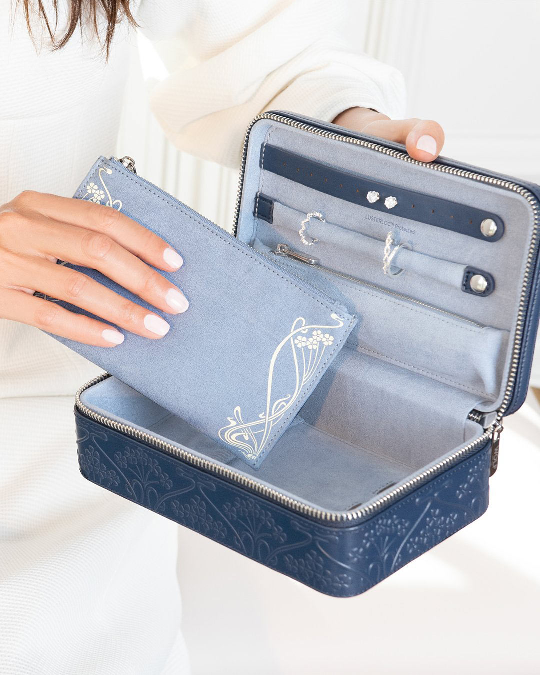 Interiér ve světle modrým odstínu byl navržen s ohledem na uspořádané ukládání – najdeme zde kapsičku na zip, pásek k upevnění náušnic a prstenů a prostor na drobnější šperky. Celek je vystlán inovativním materiálem LusterLoc™, který neutralizuje plyny způsobující matnění a zajišťuje ochranu šperků až po dobu 35 let. Kompaktní rozměry a pevný zip způsobují, že pouzdro se skvěle osvědčí během cestování. Pouzdro WOLF x Liberty 381217 je spojením funkčnosti, elegance a řemesla, které se dokonale hodí pro každou milovnici šperků.