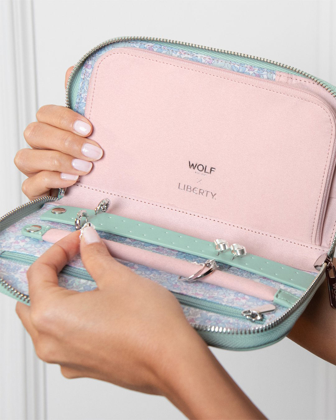 Interiér ve světle růžovém odstínu byl navržen s ohledem na přehledné ukládání – je vybaven kapsičkou na zip, páskem na náušnice a prsteny a elastickými přihrádkami na drobné šperky. Díky použití inovativní výstelky LusterLoc™ interiér neutralizuje plyny způsobující matnění a chrání šperky až po dobu 35 let. Štíhlá forma a zapínání na zip způsobují, že pouzdro připomínající peněženku se skvěle hodí na každou cestu. Organizér WOLF x Liberty 381451 je elegantní a praktické pouzdro, které se osvědčí jak doma, tak na cestách, dbající o šperky bezpečným a stylovým způsobem.