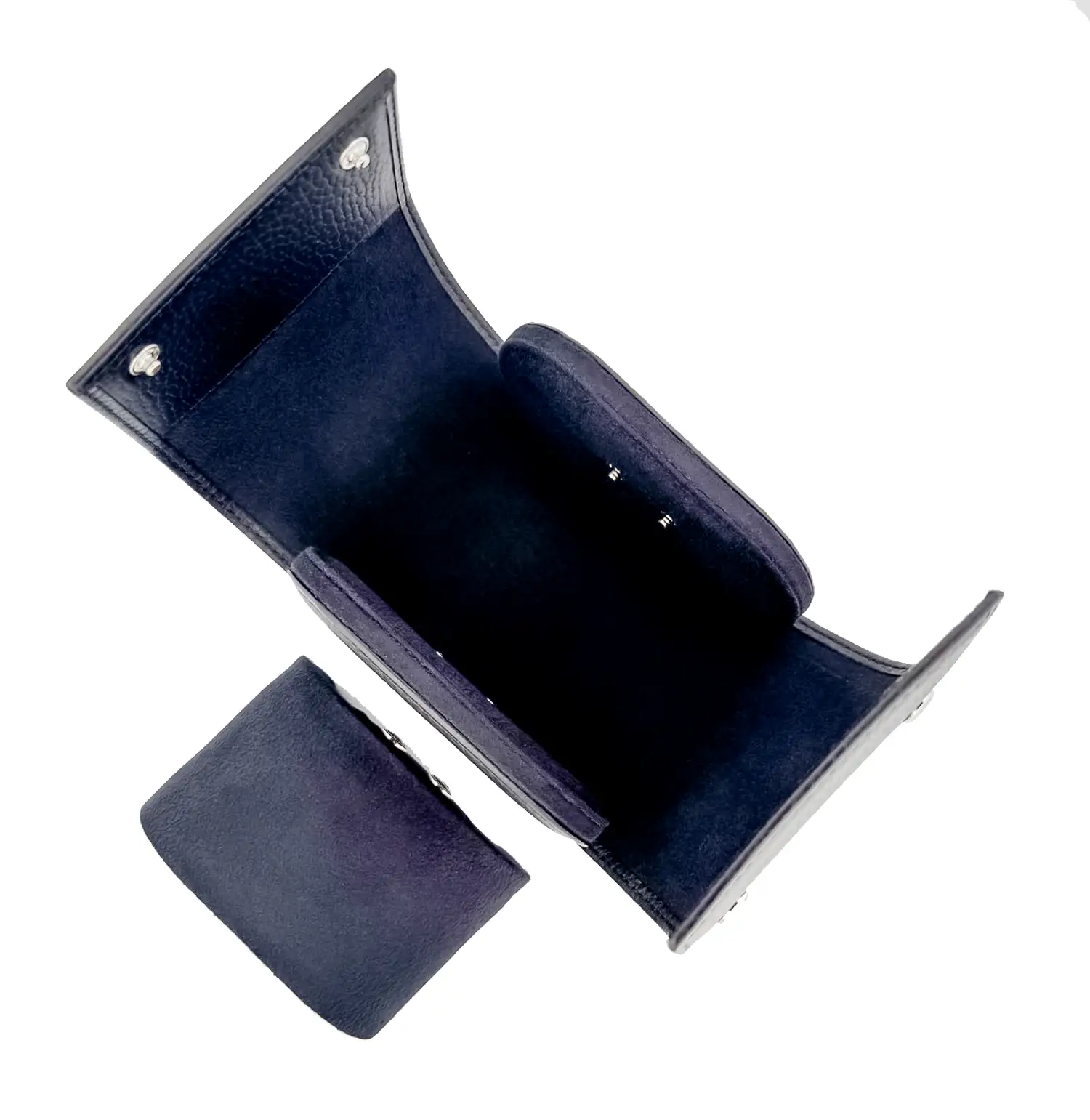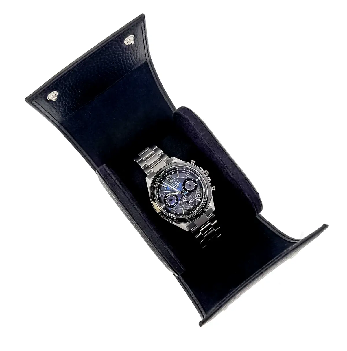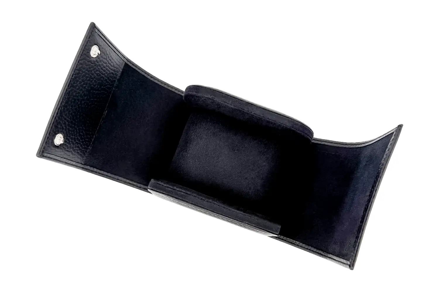 Pouzdro se uzavírá pomocí pevných patentů, jež zajišťují bezpečné držení obsahu i během přepravy. Hodinky se upevňují na přizpůsobeném polštářku, který je rovněž fixován uvnitř pouzdra pomocí patentu – díky tomu časomíra zůstává stabilní v každé poloze. Kompaktní rozměry 8,7 × 7,3 × 10,8 cm umožňují snadné uložení do kufru nebo cestovní tašky a jeho elegantní vzhled se dokonale hodí jak pro každodenní, tak i pro business použití.