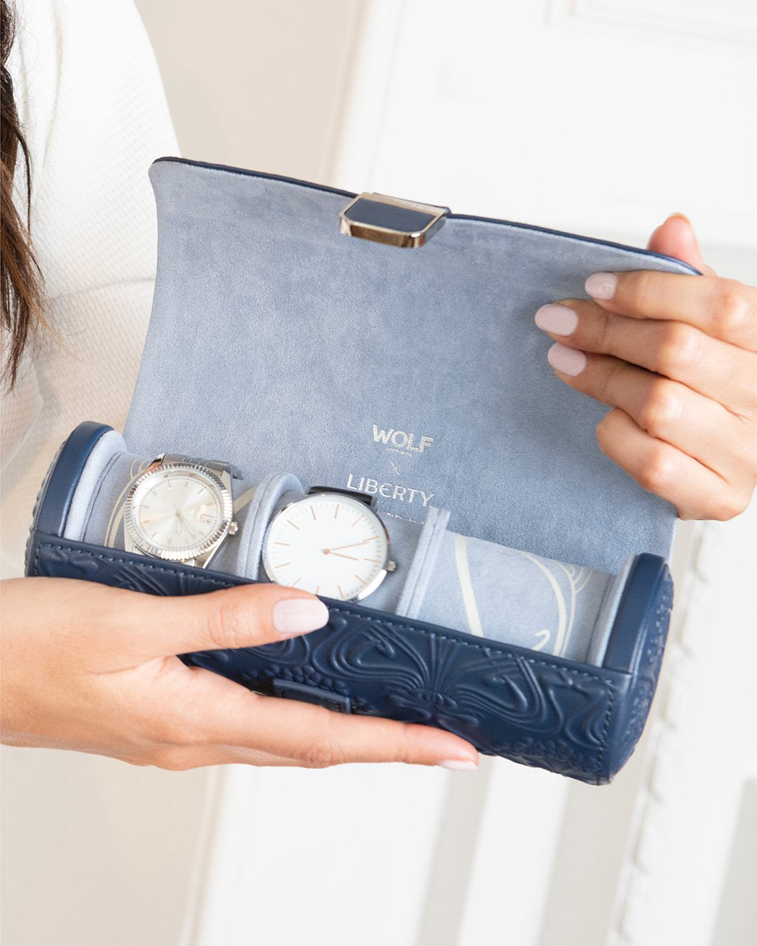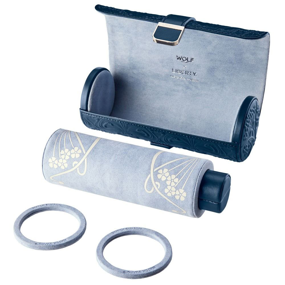 Pouzdro na 3 hodinky WOLF x Liberty 381517 je luxusní futrál na časoměry, vzniklý ve spolupráci s renomovaným londýnským domem Liberty. Dokončené v hlubokém modrým odstínu s charakteristickým ražením ve stylu Liberty působí nesmírně elegantně a nadčasově. Je to doplněk vytvořený s ohledem na ženy, které chtějí uchovávat své hodinky jedinečným a zároveň bezpečným způsobem.