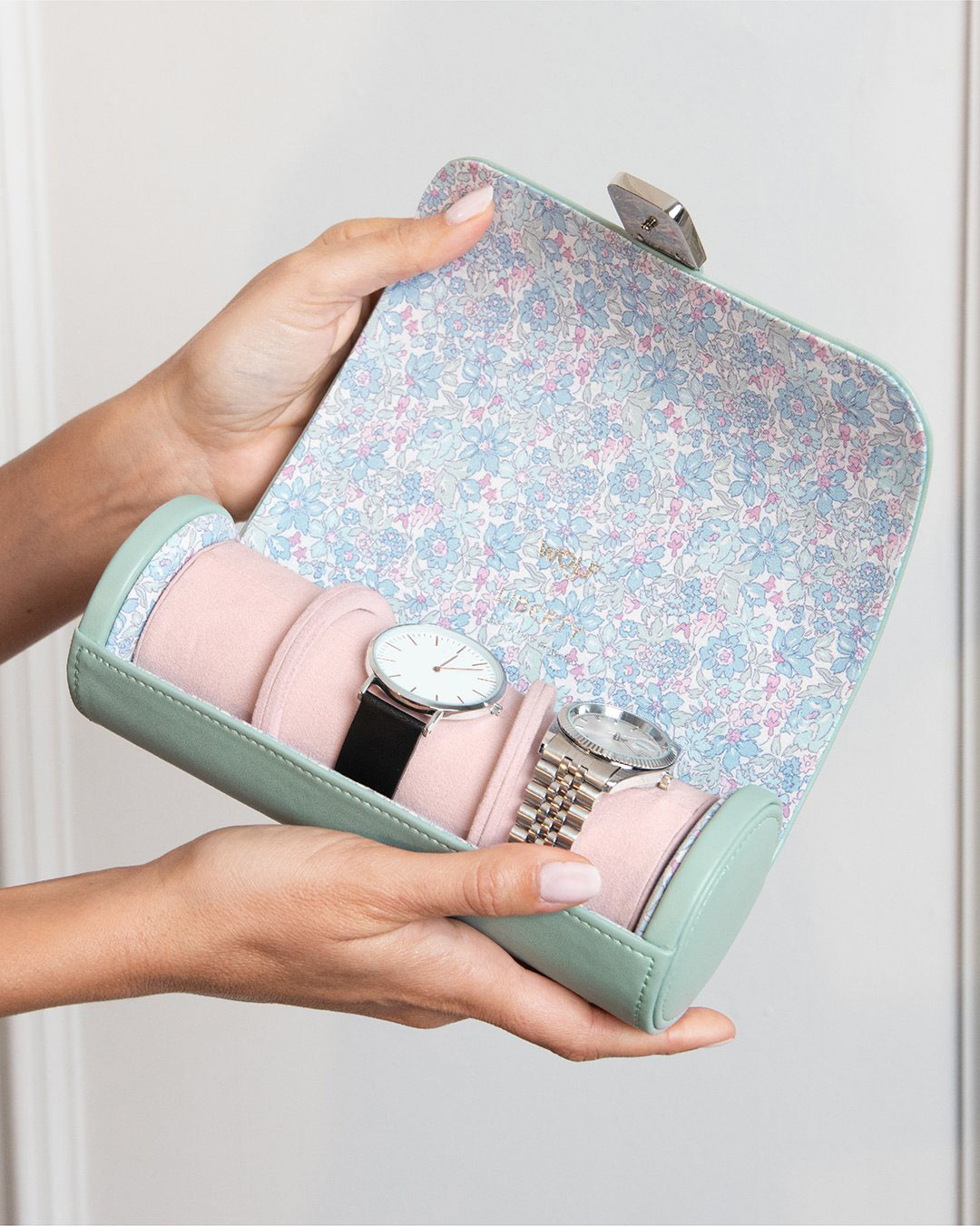 Pouzdro na 3 hodinky WOLF x Liberty 381551 je luxusní futrál na časoměry, vzniklý ve spolupráci s renomovaným londýnským domem Liberty. Dokončené v hlubokém mátové odstínu s charakteristickým ražením ve stylu Liberty působí nesmírně elegantně a nadčasově. Je to doplněk vytvořený s ohledem na ženy, které chtějí uchovávat své hodinky jedinečným a zároveň bezpečným způsobem.