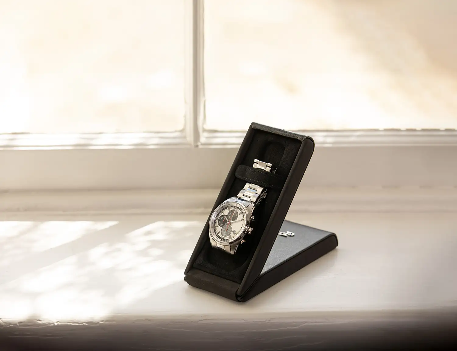 Minimalistický tvar a provedení z černé veganské kůže a nubuku zajišťují, že se toto příslušenství skvěle hodí do moderních interiérů. Jemný polštářek chrání hodinky před poškrábáním a logo „DP“ a kovové detaily ve stříbrném tónu dodávají celku prestižní vzhled.