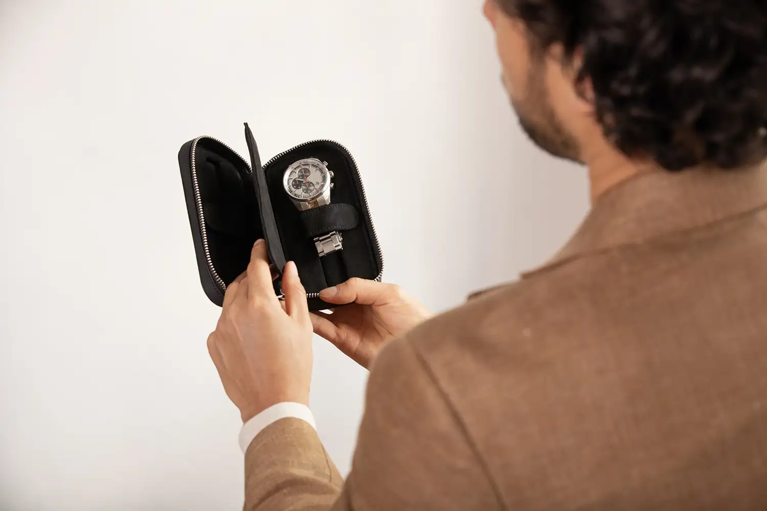 Pouzdro WOLF Philipp 190205 je kompaktní a elegantní cestovní futrál navržený pro bezpečné uložení dvou oblíbených hodinek – ať už se jedná o klasický společenský model, nebo sportovní diver. Minimalistický tvar a vysoká kvalita zpracování z něj činí ideální doplněk pro každou příležitost, jak na cestách, tak i pro domácí uložení.