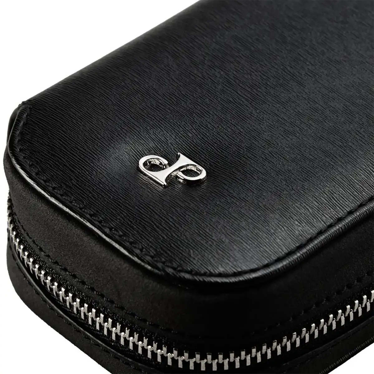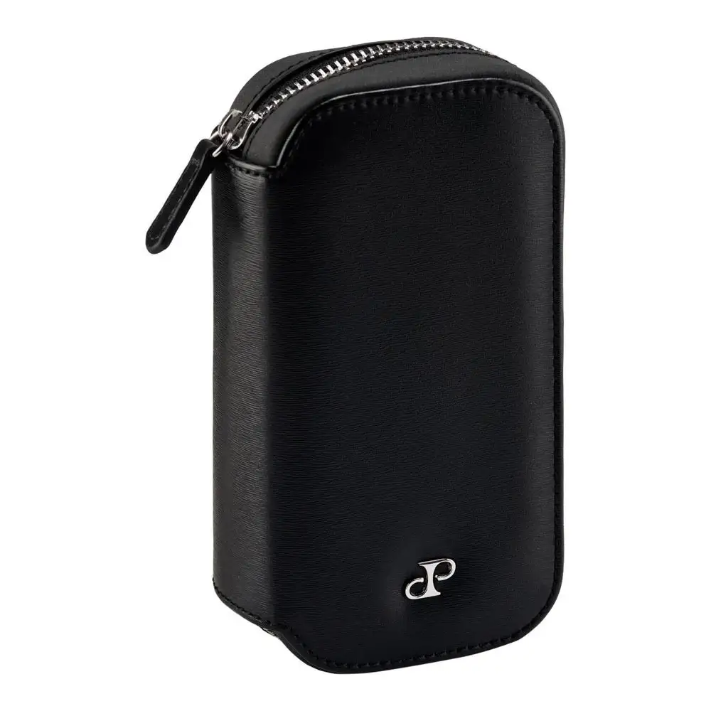 Vnější vrstva je vyrobena z černé, embosované veganské kůže, která dodává celku nadčasový charakter. Interiér je vyložen měkkým materiálem Ultrasuede v černé barvě, jenž chrání povrch pouzdra hodinek před poškrábáním. Pouzdro je vybaveno dvěma polstrovanými přihrádkami na hodinky, zajištěnými pevným zipem. Celek doplňují detaily ve stříbrné barvě a logo „DP“.