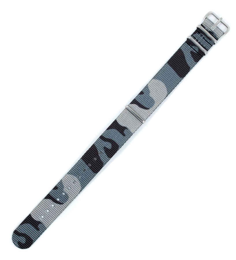 Látkový řemínek k hodinkám Hirsch Rush NATO v šedé camo. Pevné, voděodolné, ideální pro diverské nebo plavecké hodinky. Přezka a poutka na opasek z leštěné oceli dodávají jedinečný styl. Celková délka popruhu je 260 mm.