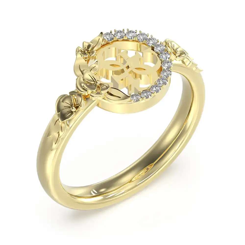 Prsten Guess 4 Love JUBR05042JWYG ve velikosti 10 (průměr 15,6 mm) je elegantní dámský šperk, který spojuje romantickou symboliku s nezaměnitelným DNA značky Guess. Vyroben z pozlacené ušlechtilé oceli, zaujme centrálním motivem loga 4G v ažurovém provedení, obklopeným jemným kruhem třpytivých zirkonů, které dodávají celku lehkost a zářivý lesk. Obroučku zdobí decentní, plasticky tvarované květy inspirované kolekcí 4 Love, jež podtrhují ženský charakter prstenu a činí z něj ideální volbu pro každodenní nošení i stylový doplněk jarních a letních outfitů.