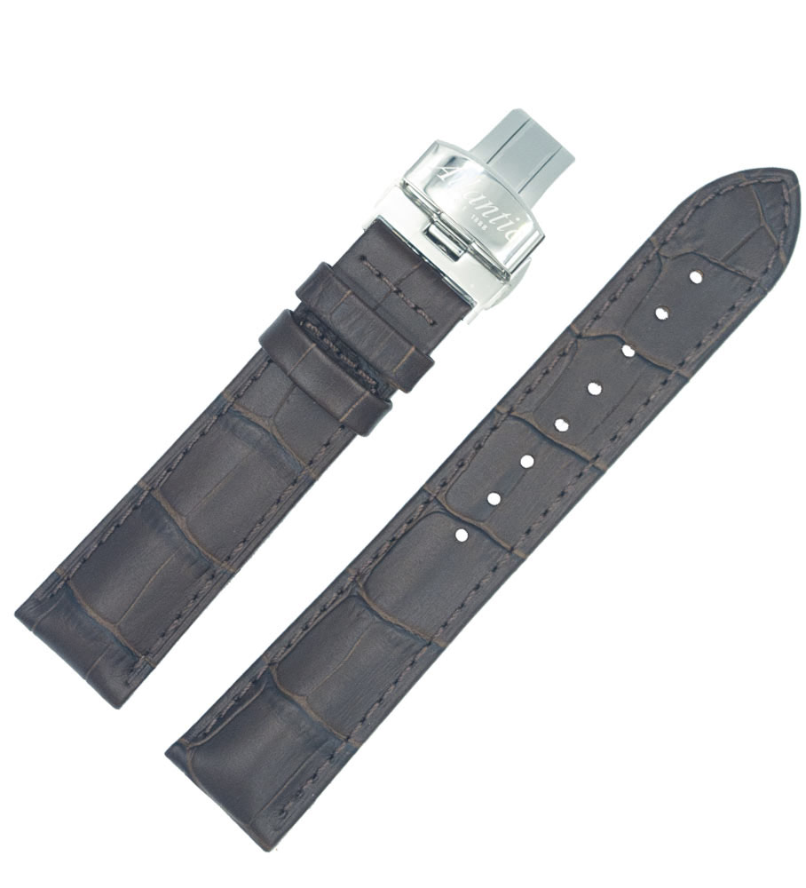 Originální řemínek na hodinky Atlantic. Vyrobeno z hnědé kůže se vzorem aligátora. Šířka 20 mm v místě upevnění a 18 mm u přezky. Stříbrná motýlková spona s logem Atlantic. Elegantní kožený řemínek pro pánské hodinky Atlantic.