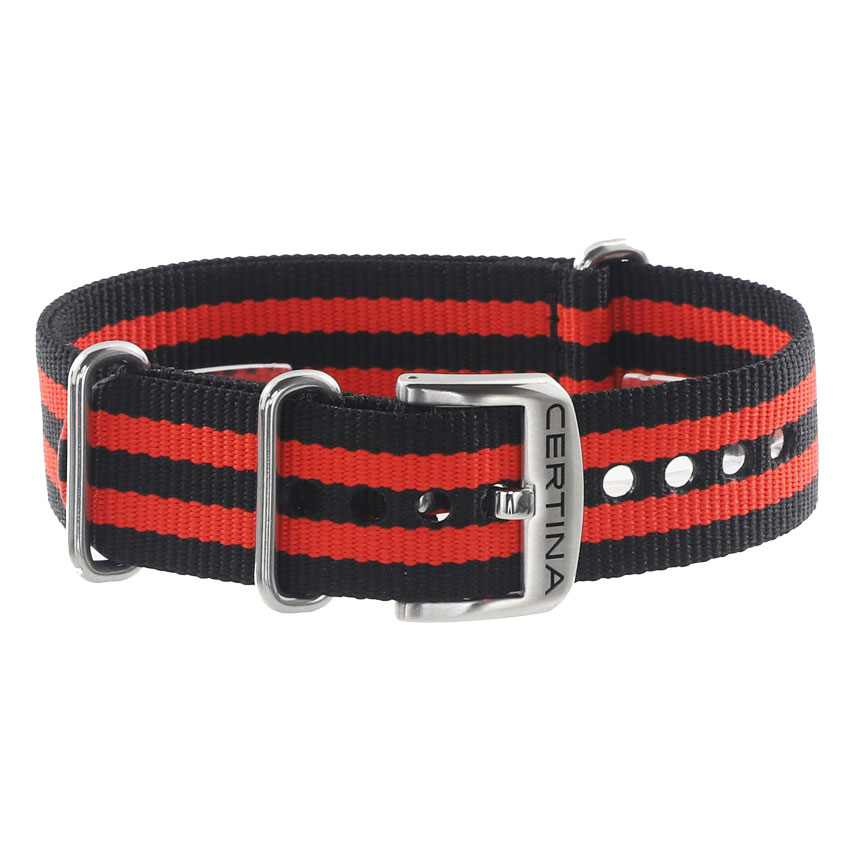 Originální látkový řemínek NATO C604020493 pro pánské hodinky Certina DS Podium Chrono Precidrive. Věnováno modelům se servisním číslem C034417 na zadní straně hodinek a také dalším hodinkám, které lze osadit páskem o šířce 20 mm. Vyrobeno z černého a červeného plastu, zakončené ocelovou přezkou s logem Certina.