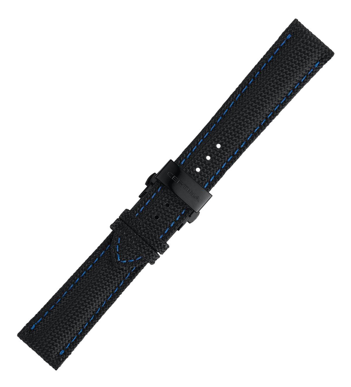 Originální látkový řemínek pro pánské hodinky Certina DS Podium Chrono Precidrive se servisním číslem na zadní straně pouzdra, na spodní straně hodinek C034417. Pasuje i na další modely Certina, které lze osadit páskem o šířce 20 mm. C604021981 je vybavena bezpečnou a pohodlnou černou motýlkovou sponou, která se otevírá pomocí knoflíků.