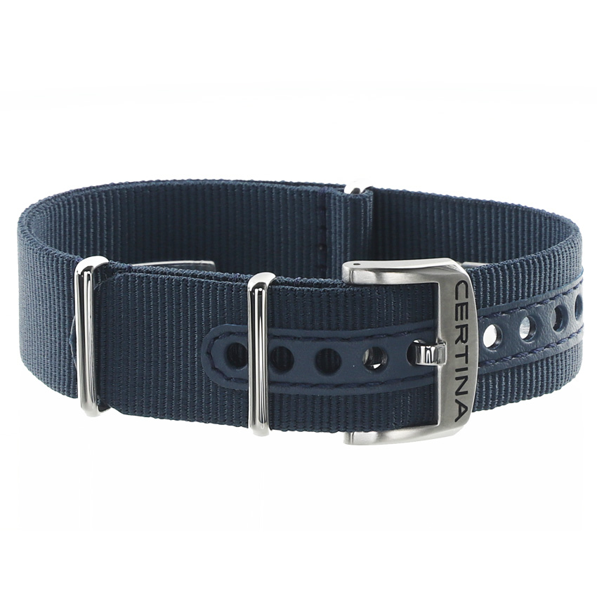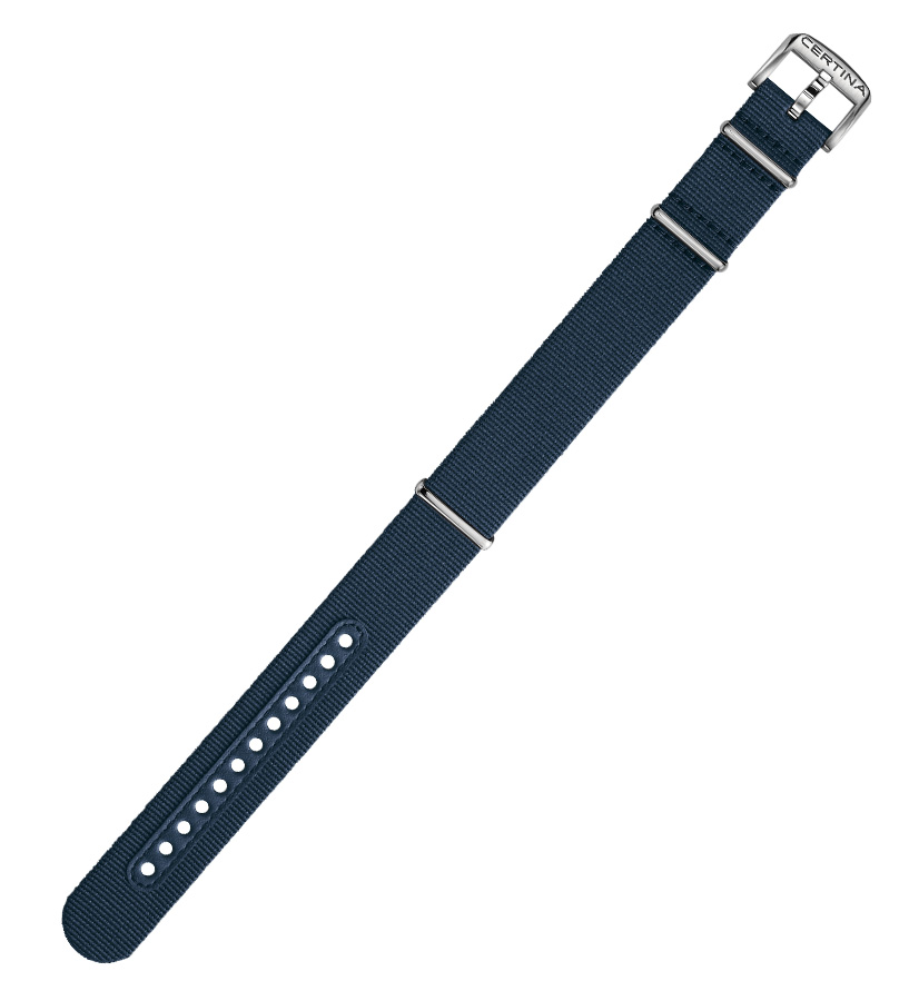 Originální řemínek z materiálu NATO pro pánské hodinky DS Action GMT Powermatic 80 se servisním číslem na zadní straně pouzdra, ze spodní části hodinek C032429 , ale i další modely, na které lze připevnit řemínek o šířce 21 mm. Vyrobeno z modrého plastu, zakončené ocelovou přezkou s logem Certina.