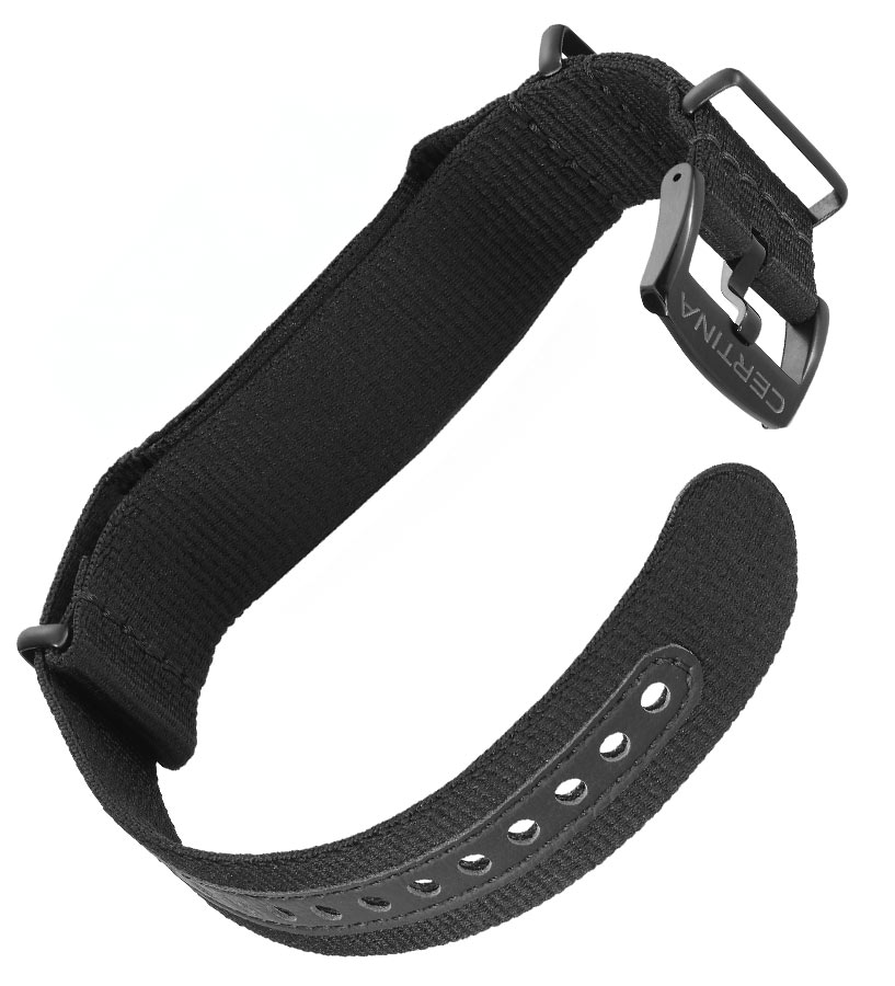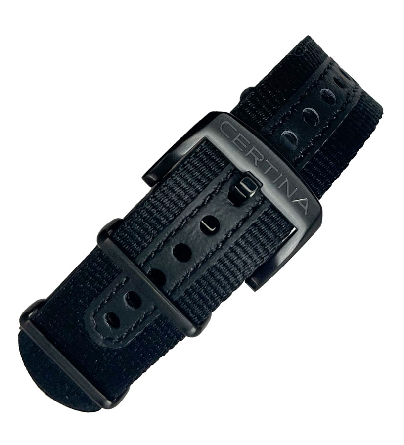 Originální látkový řemínek NATO pro pánské hodinky Certina DS Action Diver se servisním číslem C032607 na zadní straně pouzdra, na spodní straně hodinek, ale i ostatní modely, které lze osadit řemínkem o šířce 21 mm. Vyrobeno z černého plastu, zakončené ocelovou přezkou s logem Certina pokrytou černým PVD povlakem.