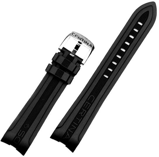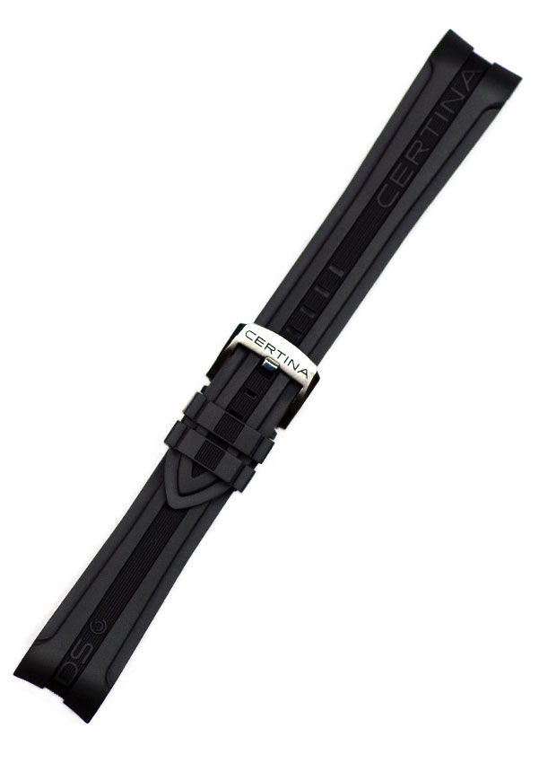 Vodotěsný řemínek Certina C603017928 z černé gumy. Věnováno pouze pánským hodinkám Certina DS Chrono GMT se servisním číslem C001639 , které se nachází na zadní straně pouzdra, spodní části hodinek. Spona z nerezové oceli s nápisem Certina.