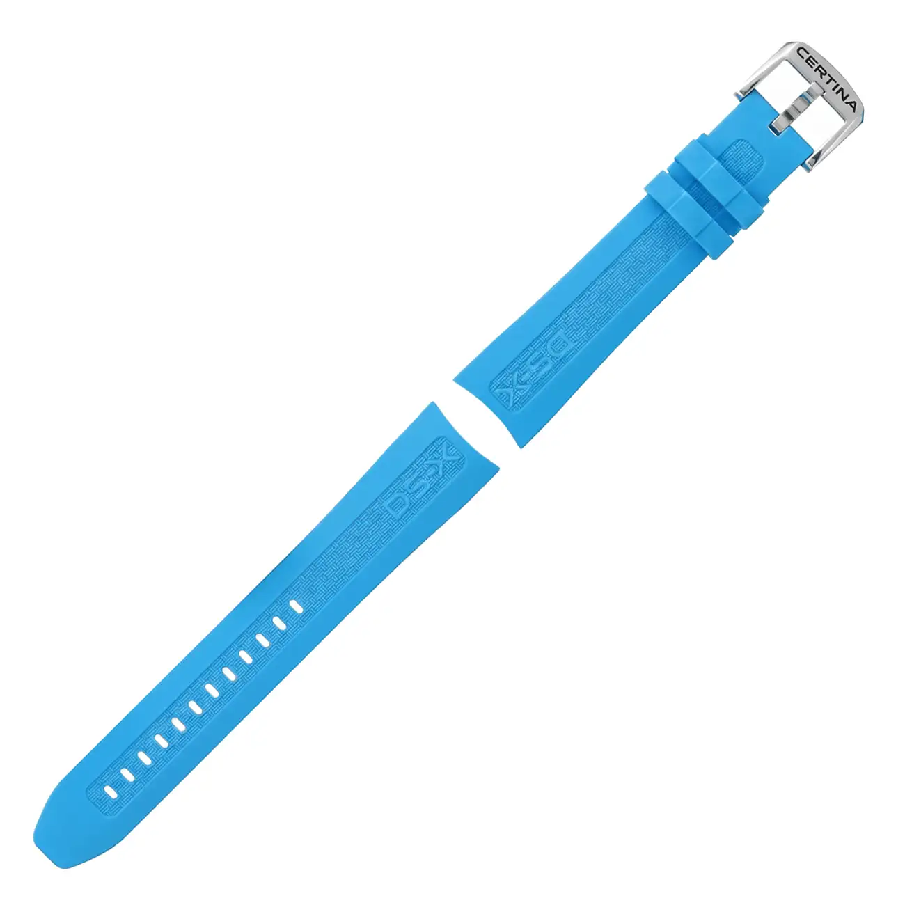 Tento gumový řemínek o šířce 20 mm je zcela voděodolný, takže si jej bez obav můžete vzít do bazénu nebo na pláž. Na fotografii je vidět moderní mřížkovaný vzor a nápisy DS-X, které skvěle ladí s dynamickým stylem této řady. Největší výhoda je však to, co není vidět na první pohled – speciální ražba na spodní straně. Tato konstrukce zajišťuje, že pokožka pod řemínkem může volně dýchat, díky čemuž se ruka méně potí i v horkých dnech. Řemínek má pevnou ocelovou sponu s logem Certina a systém rychloupínacích stěžejek, což znamená, že jej vyměníte sami během několika sekund, bez návštěvy hodináře a bez jakéhokoliv nářadí.