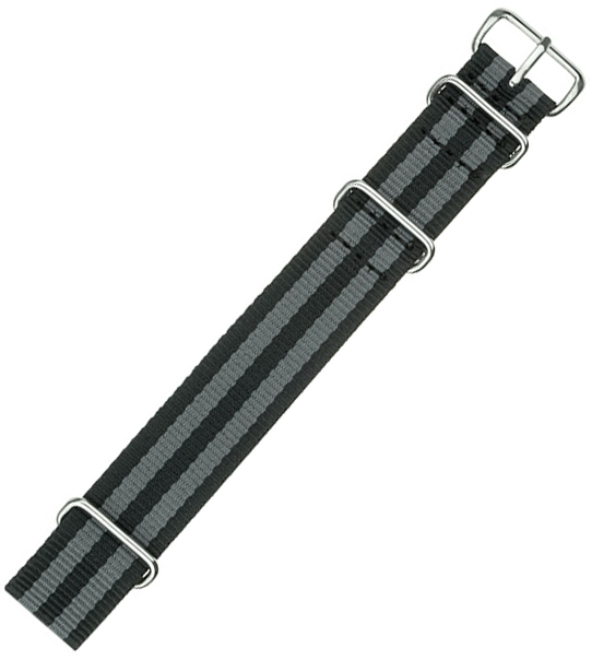 Textilní nylonový řemínek k hodinkám NATO stylu, velikost 24 mm. Černá barva se dvěma šedými pruhy. Skvěle se hodí ke sportovním, vojenským nebo retro hodinkám. Řemínek NATO byl vytvořen speciálně pro armádu, aby zvládla náročné podmínky během misí. Je lehký, voděodolný a odolný. Dá se v něm plavat i potápět a odolá extrémním podmínkám pod vodou i na hladině.