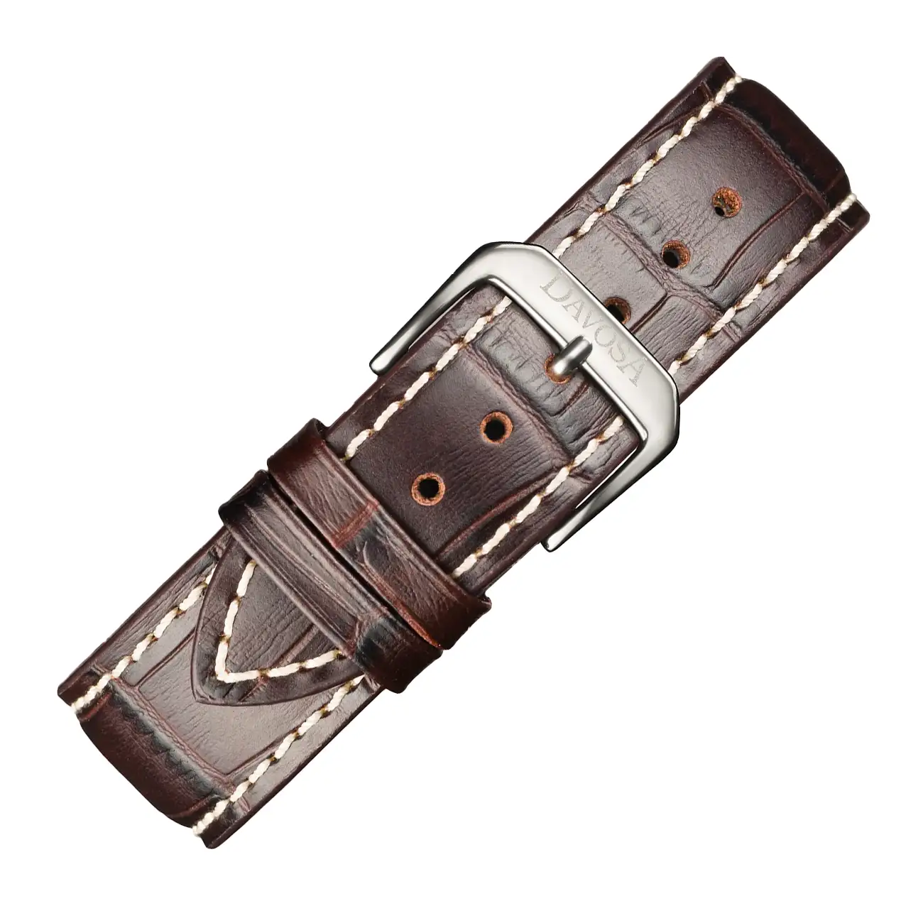 Řemínek je vyroben z přírodní kůže v hnědé barvě s embosovaným vzorem aligátora. Povrch kůže má jemný lesk, který dodává celku ušlechtilý vzhled bez přehnané dekorativnosti. Bílé prošití vedené podél okrajů zvýrazňuje linii řemínku a zároveň posiluje jeho konstrukci.