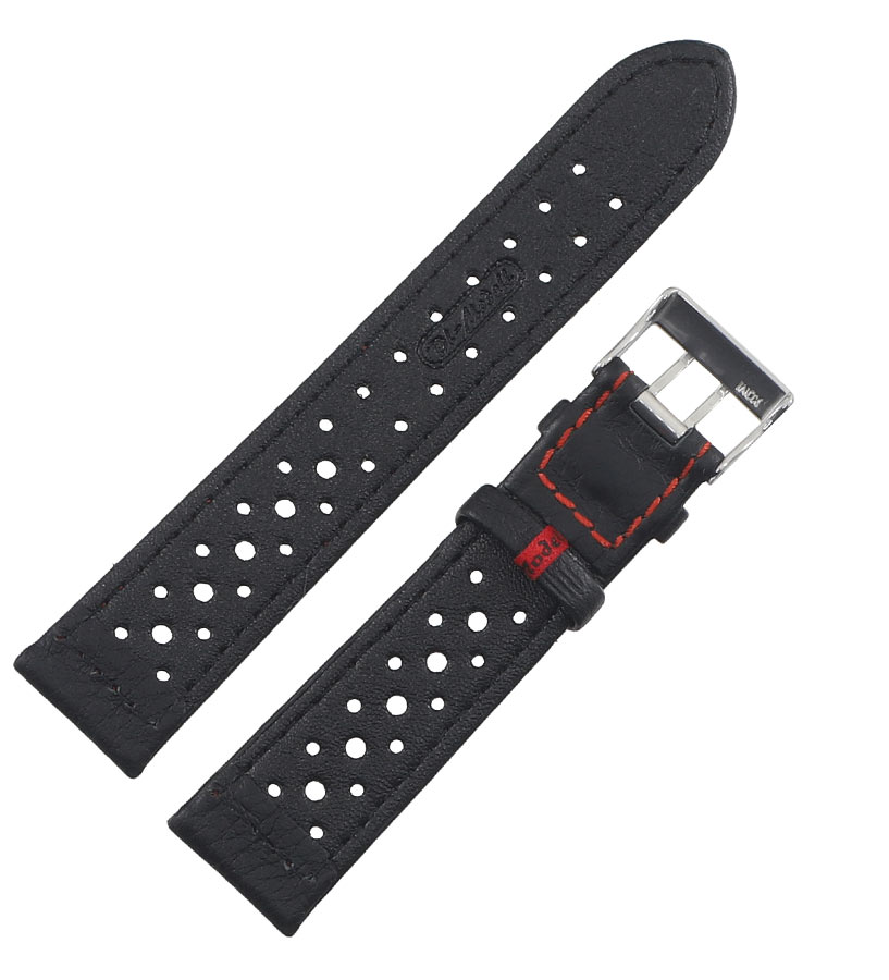 Perforovaný vzor odkazuje na klasické závodní řemínky a zároveň zvyšuje komfort při nošení – otvory umožňují volný průchod vzduchu, díky čemuž řemínek zůstává pohodlný i při dlouhodobém používání. Ocelová spona s dvojitou trnovou přezkou zaručuje pevné a bezpečné zapínání, ideální pro každodenní nošení i sportovní aktivity.