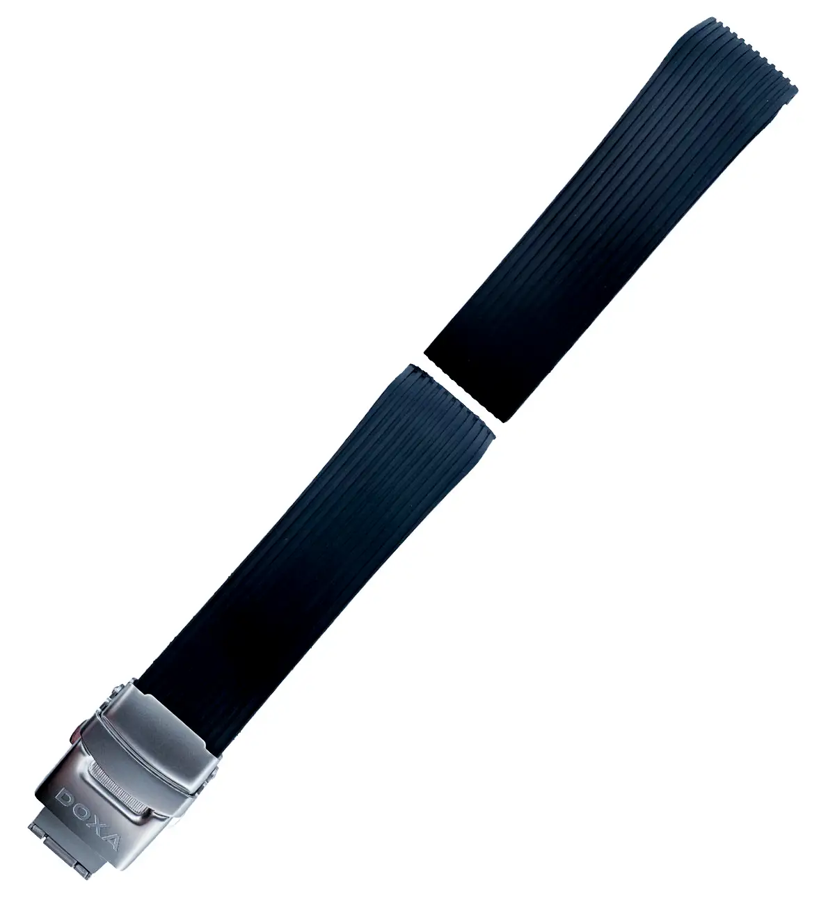 Originální řemínek exkluzivně pro pánské hodinky Doxa Grafic Mistero Round 359.10. Vyrobeno z voděodolné, měkké gumy v černé barvě se vzorem svislých pruhů. Nerezová motýlková spona s dodatečným zabezpečením dodává sportovní charakter a pohodlí při používání. Řemínek lze vzhledem ke způsobu uchycení připevnit pouze na pánské hodinky z kolekce Grafic Mistero Round.