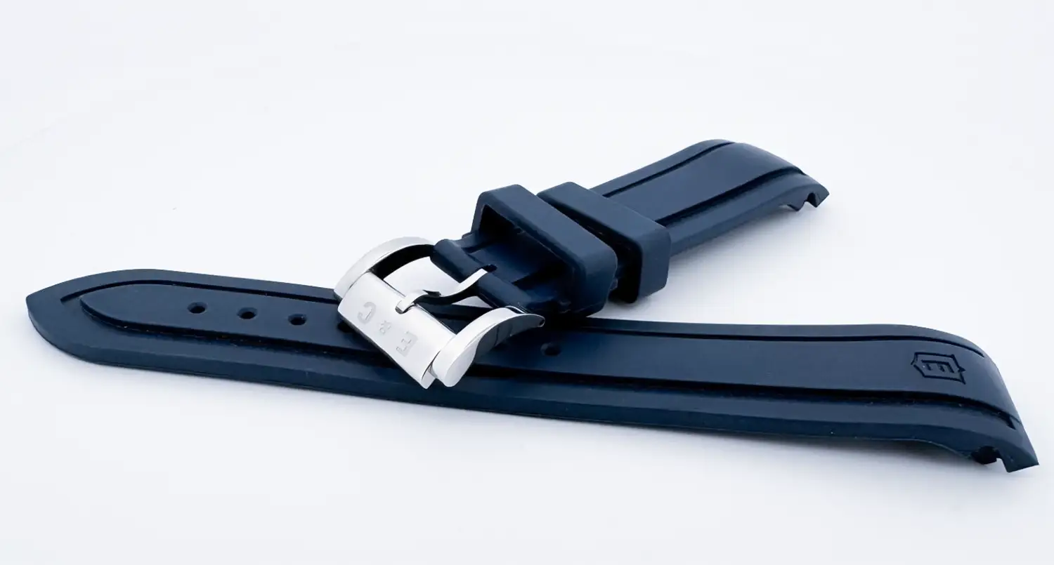 Řemínek je zakončen leštěnou sponou z ušlechtilé oceli s precizně vyrytým logem značky Eberhard. Tato spona zajišťuje bezpečné a spolehlivé zapínání a zároveň esteticky ladí s povrchem pouzdra. Pružná pryž poskytuje vysoký komfort při nošení, odolnost vůči vlhkosti, mořské soli a proměnlivým povětrnostním podmínkám.