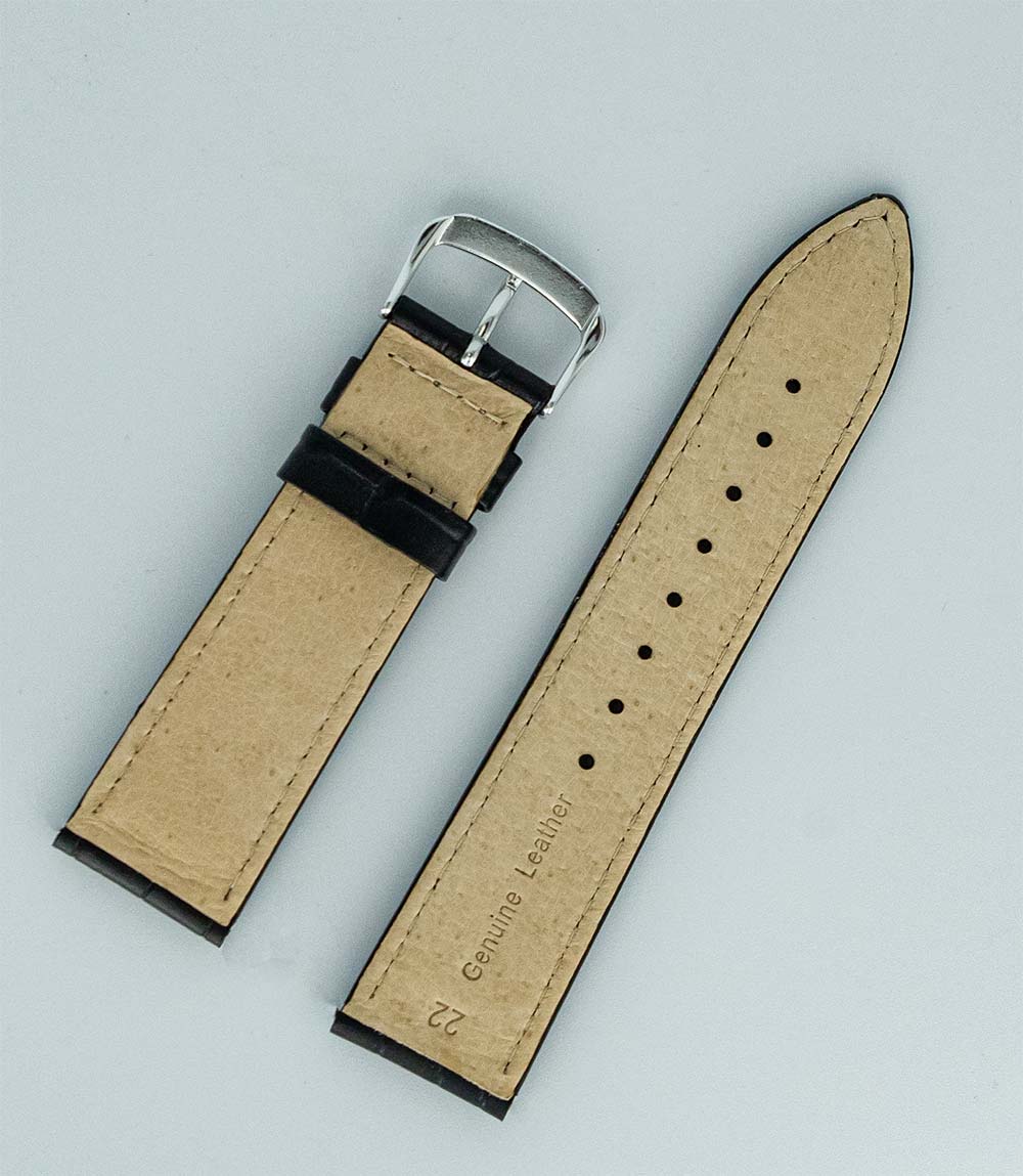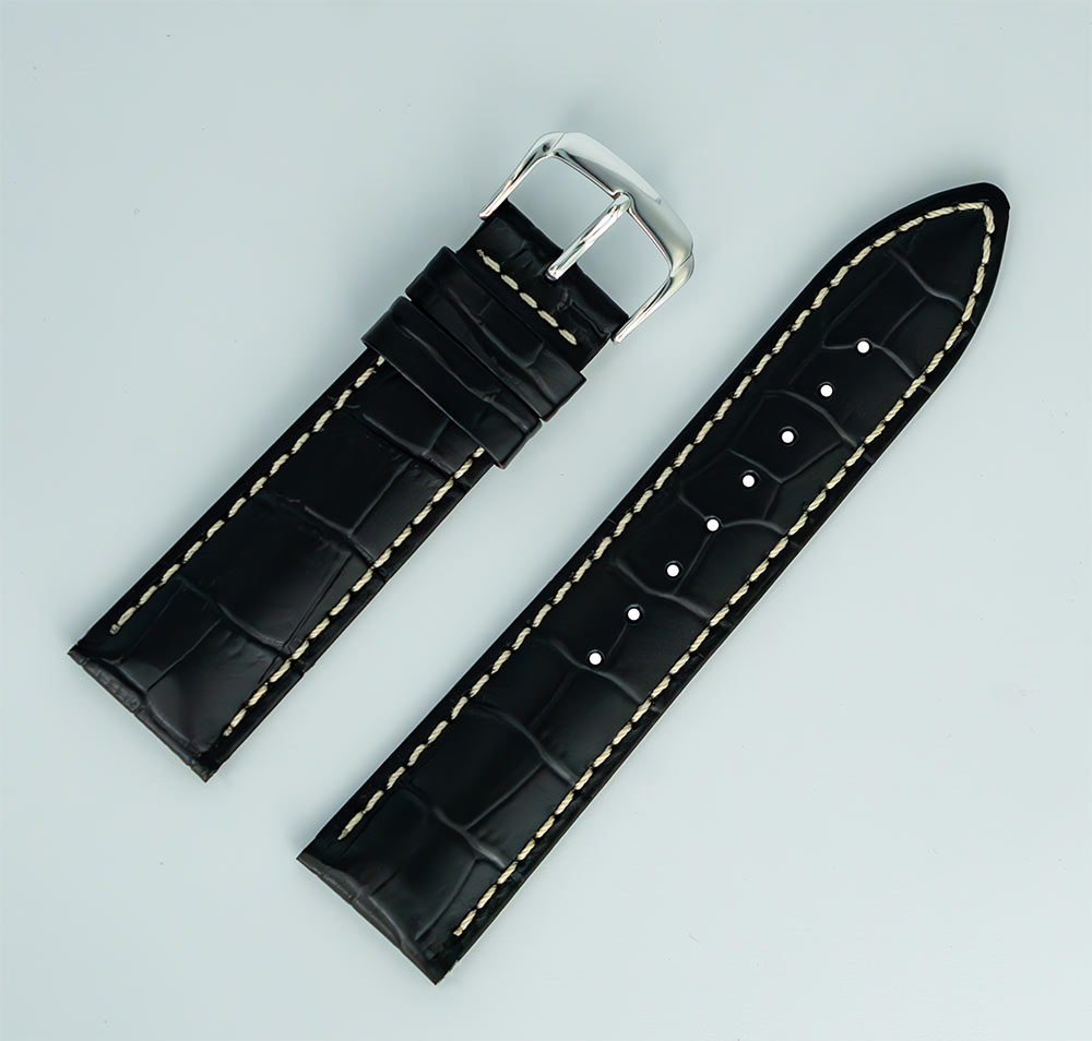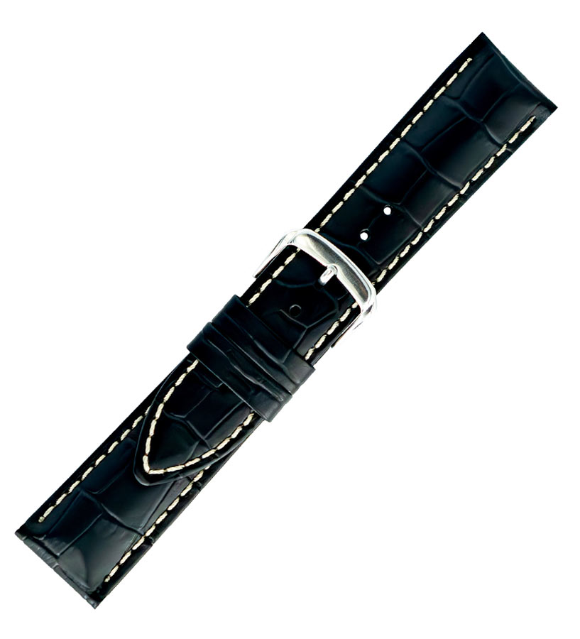 Řemínek k hodinkám Hirsch Alligatorgrain v černé barvě s bílou nití. Vyrobeno z měkké a pohodlné přírodní kůže se vzorem aligátora, který dodává sportovní a elegantní styl. Univerzální a nadčasový design z tohoto modelu dělá perfektní doplněk k pánským hodinkám.