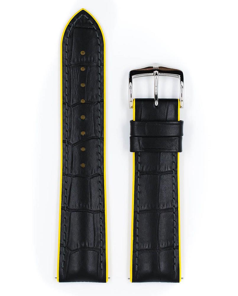 Řemínek k hodinkám Hirsch Andy je technicky vyspělá hybridní konstrukce, která spojuje klasickou eleganci italské kůže s extrémní odolností kaučuku Premium Caoutchouc. Vrchní strana řemínku s aligátoří strukturou v polomatné černi kontrastuje s intenzivně žlutou spodní částí a dodává celku sportovní a výrazný charakter. Tento model byl navržen pro pánské sportovní hodinky a nabízí plnou voděodolnost i odolnost vůči vnějším vlivům, což z něj činí ideální volbu pro osoby s aktivním životním stylem.