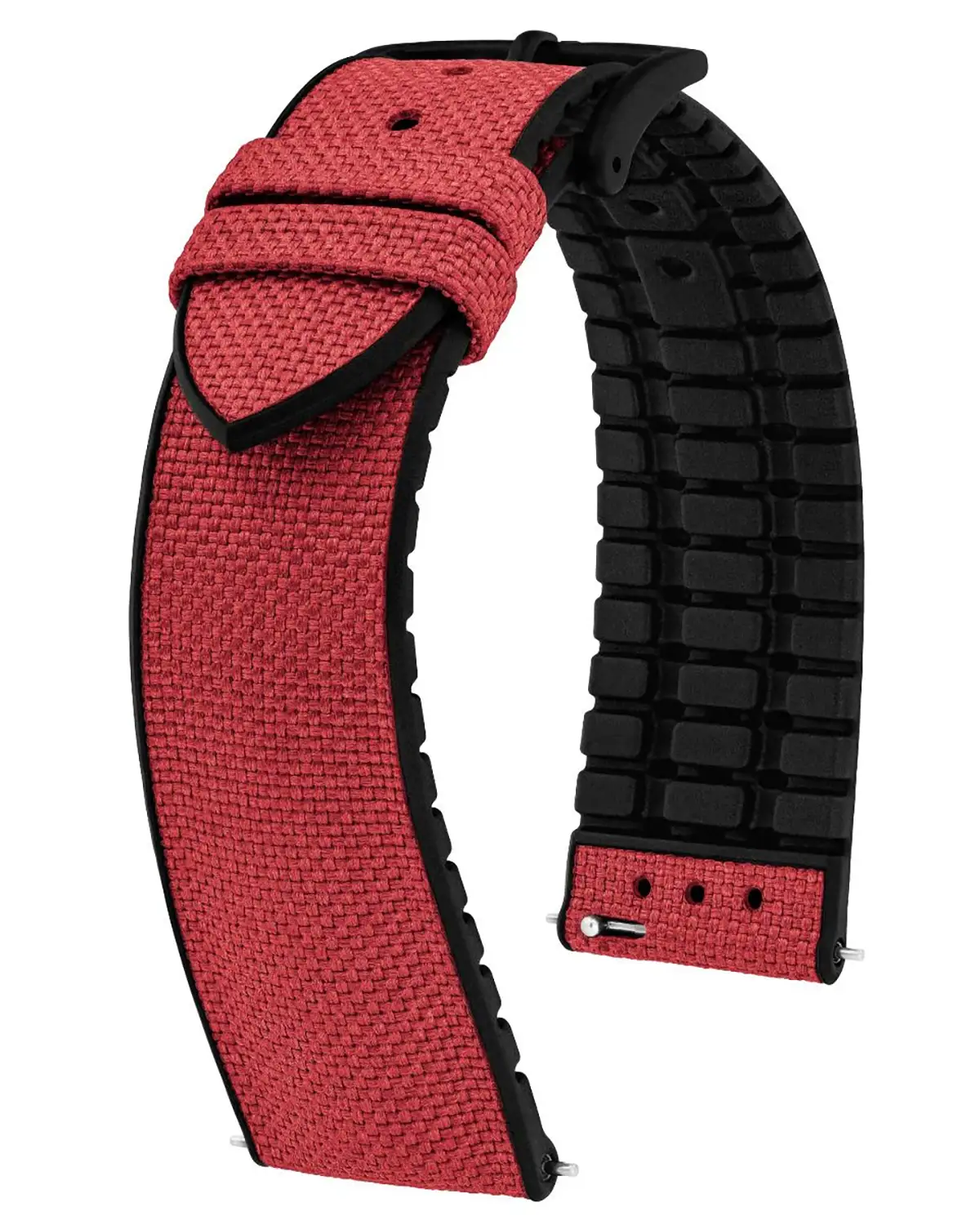 Vrchní vrstva řemínku je vyrobena z SEAQUAL® MARINE PLASTIC – recyklovaného odpadu z oceánů, řek a pobřeží. Její struktura připomíná plachtovinu a matný vínový odstín dodává designu ušlechtilý, a zároveň dynamický charakter. Na spodní straně byl použit kaučuk Hirsch Premium Caoutchouc, díky čemuž je řemínek pružný, antialergický a mimořádně odolný při každodenním nošení.